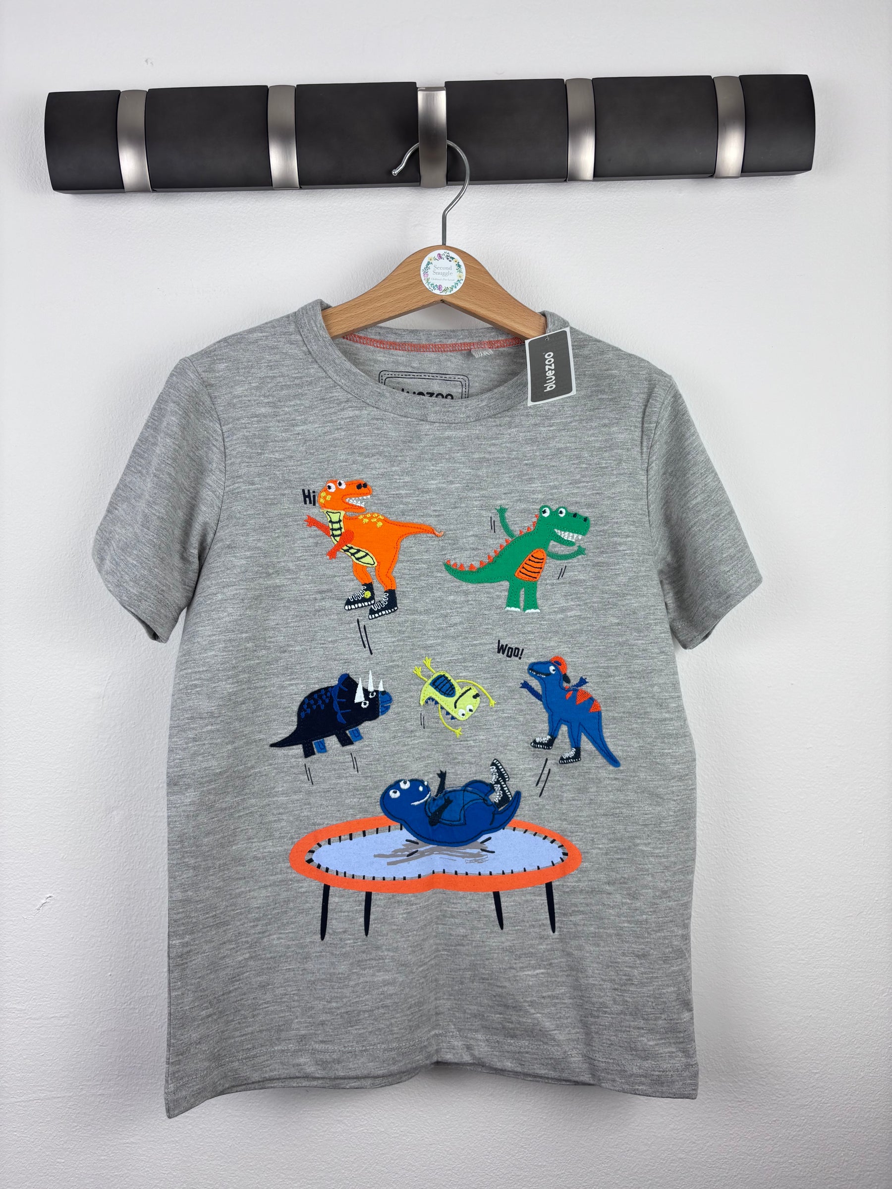 This fun Blue Zoo T-shirt features a group of playful dinosaurs jumping on a trampoline. The soft grey cotton makes it comfy for everyday wear, while the bright colours add a cheerful touch. Ideal for layering or wearing on its own through the seasons. This preloved top is a great pick for dino fans. A fun second hand piece that combines comfort, colour, and imagination for everyday adventures.