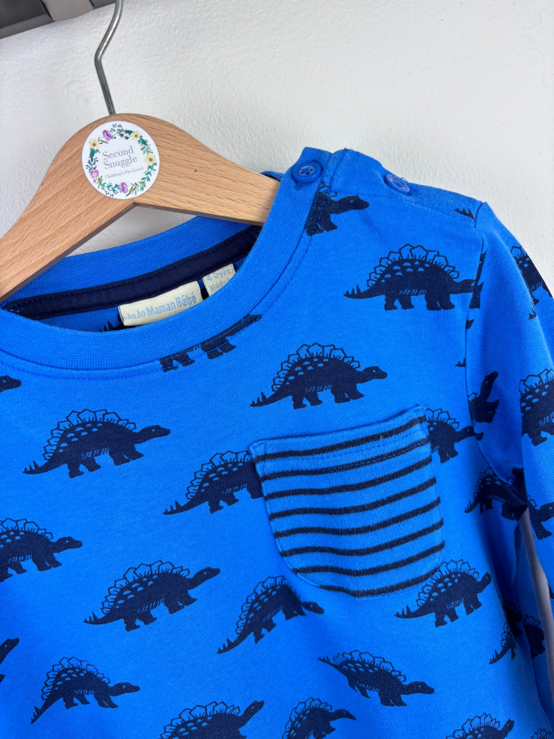 This JoJo Maman Bébé top is in very good condition and made from soft blue cotton. It has an all-over dinosaur print with a striped pocket on the chest for a fun twist. The long sleeves make it perfect for cooler days or layering under dungarees. This preloved top is great for everyday adventures and playtime. A lovely second hand find that combines comfort, quality and the fun designs JoJo Maman Bébé is loved for.