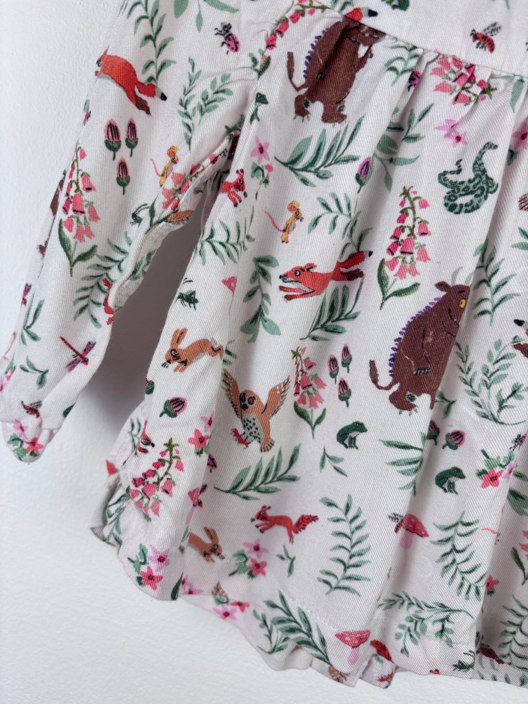 This adorable blouse from Joules is covered in a sweet woodland print with foxes, owls, and bears among colourful flowers. Made from soft cotton, it has long sleeves and gentle gathering for a relaxed, comfy fit. Perfect for pairing with leggings or jeans, it’s ideal for playdates or outings. A charming second hand preloved baby top that brings the quality and character of Joules to your child’s wardrobe. A lovely sustainable choice that keeps great children’s clothing in use and out of landfill.
