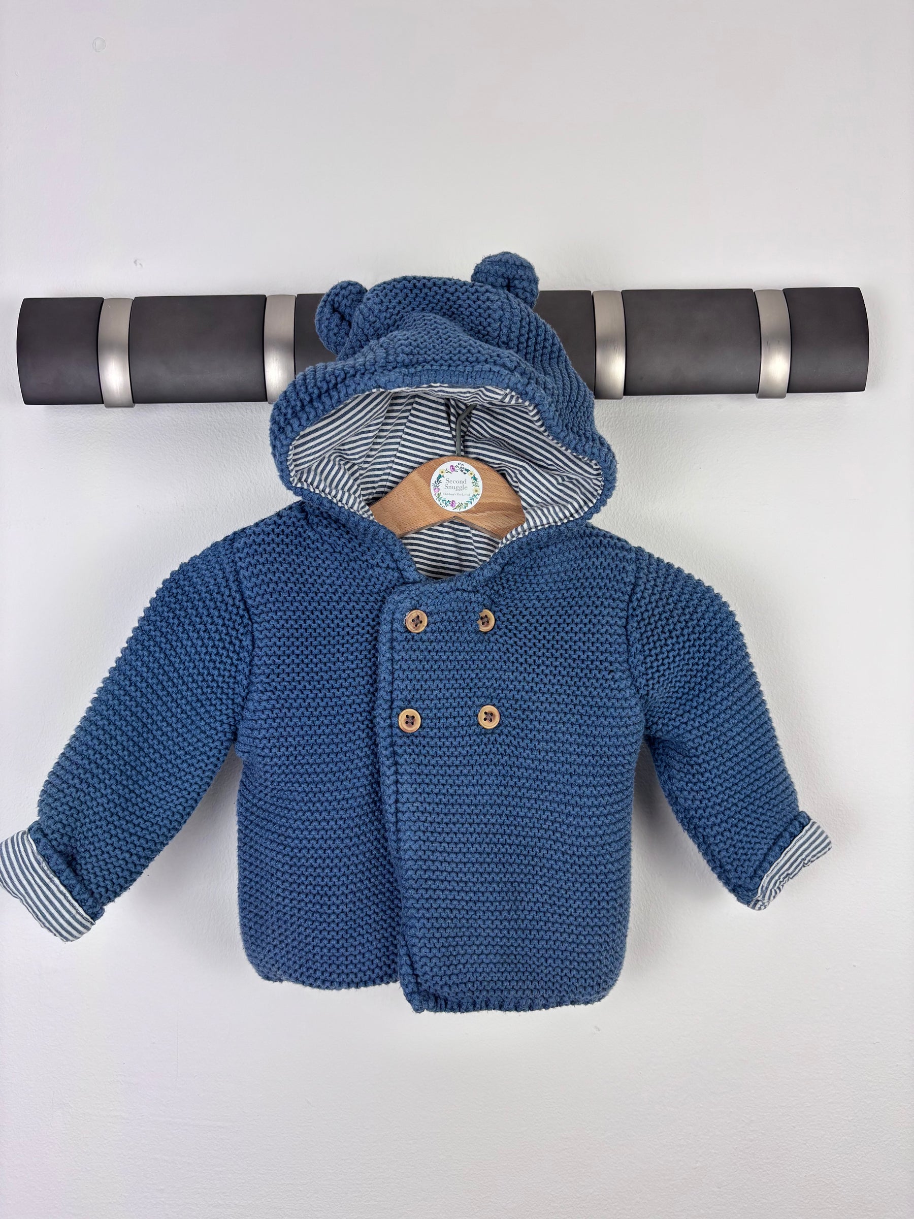 This adorable M&S hooded jacket is designed to keep babies warm and cosy. Made from soft chunky knit cotton with a striped lining, it features wooden buttons and cute little bear ears on the hood. The practical double-breasted style adds extra warmth for chilly walks or snuggly days at home. In very good condition, this preloved jacket is a delightful second hand piece that’s full of charm and comfort for newborns and tiny explorers.