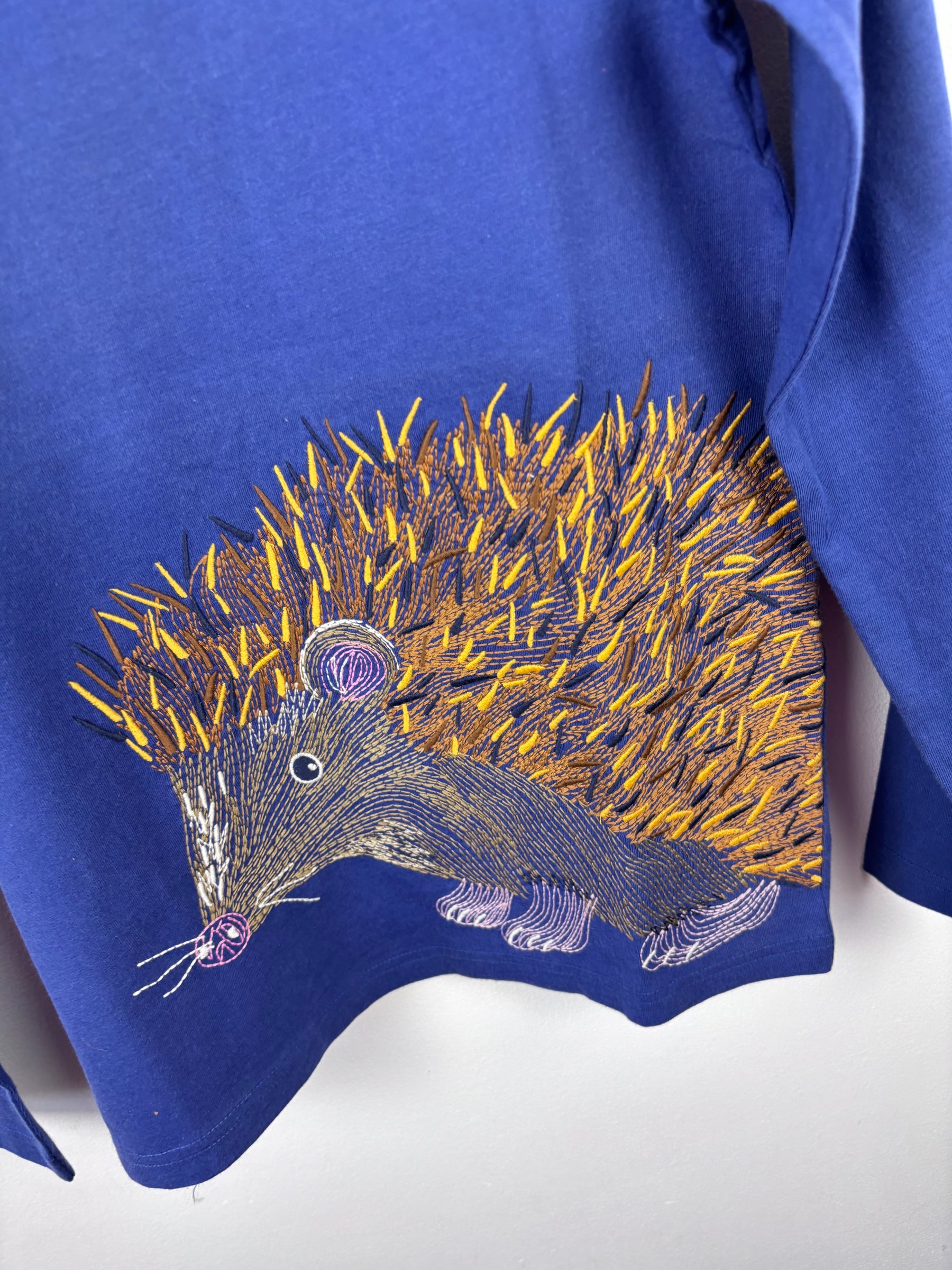 This Mini Boden long sleeve top in deep blue features an intricate embroidered hedgehog design bursting with colour and detail. The soft cotton fabric ensures comfort all day long, while the quality stitching keeps it looking great wash after wash. Perfect for animal lovers, this preloved top is a fantastic second hand find that brings charm and fun to casual outfits. In excellent condition, it’s ideal for layering through cooler months or wearing on its own with jeans.