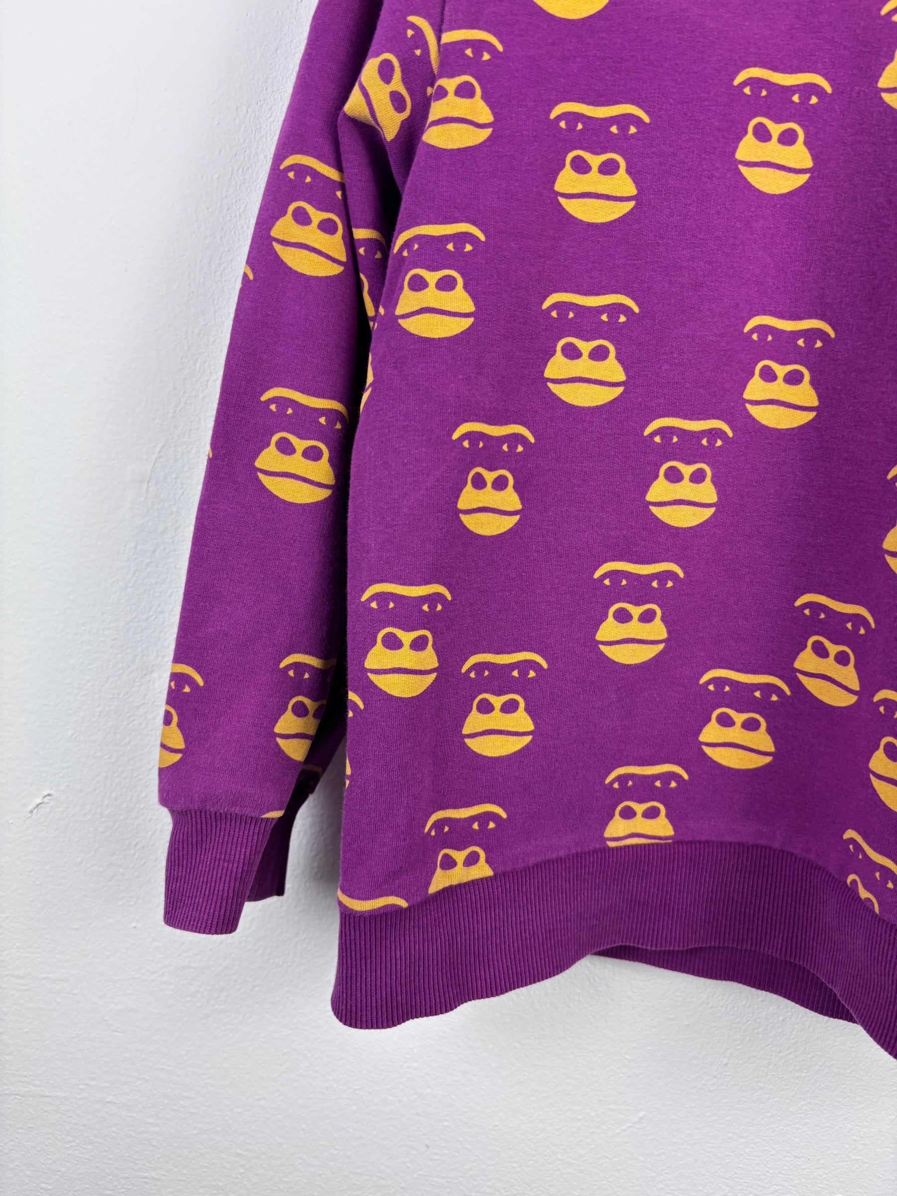This Mini Rodini sweatshirt is in excellent condition, has no size tags inside and full of playful charm. Made from soft organic cotton in purple, it features a bright monkey print across the fabric. Mini Rodini pieces are loved for their sustainable design and comfy fit, and this preloved jumper is no different. It’s perfect for everyday wear and adds a splash of colour to any outfit. A fantastic second hand sweatshirt that’s eco-friendly, fun and ready for more adventures.