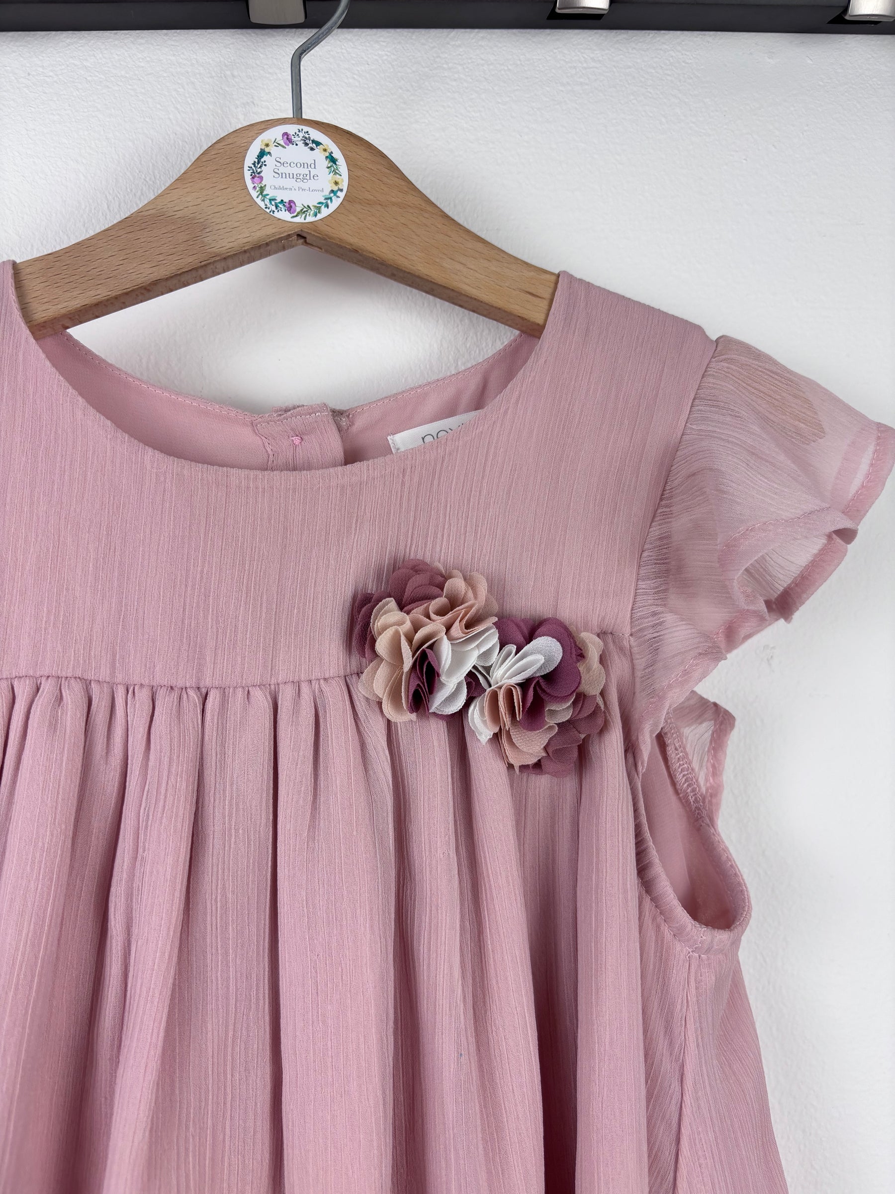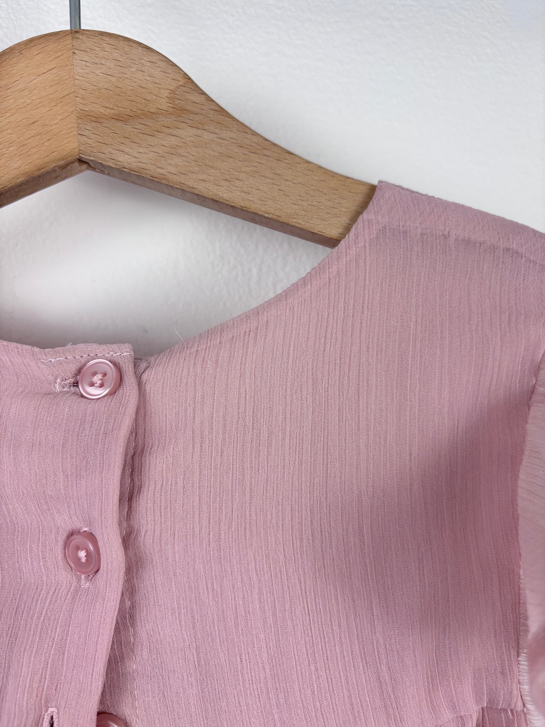 This pink chiffon dress from Next is floaty, soft and perfect for parties or weddings. It has delicate frilled sleeves and floral appliqués on the chest for a pretty finish. The lightweight fabric and lining make it comfortable for all-day wear. Ideal for twirling and dancing, it’s an easy way to dress up for special moments. This preloved dress is a lovely second hand piece that feels both elegant and playful for little ones.