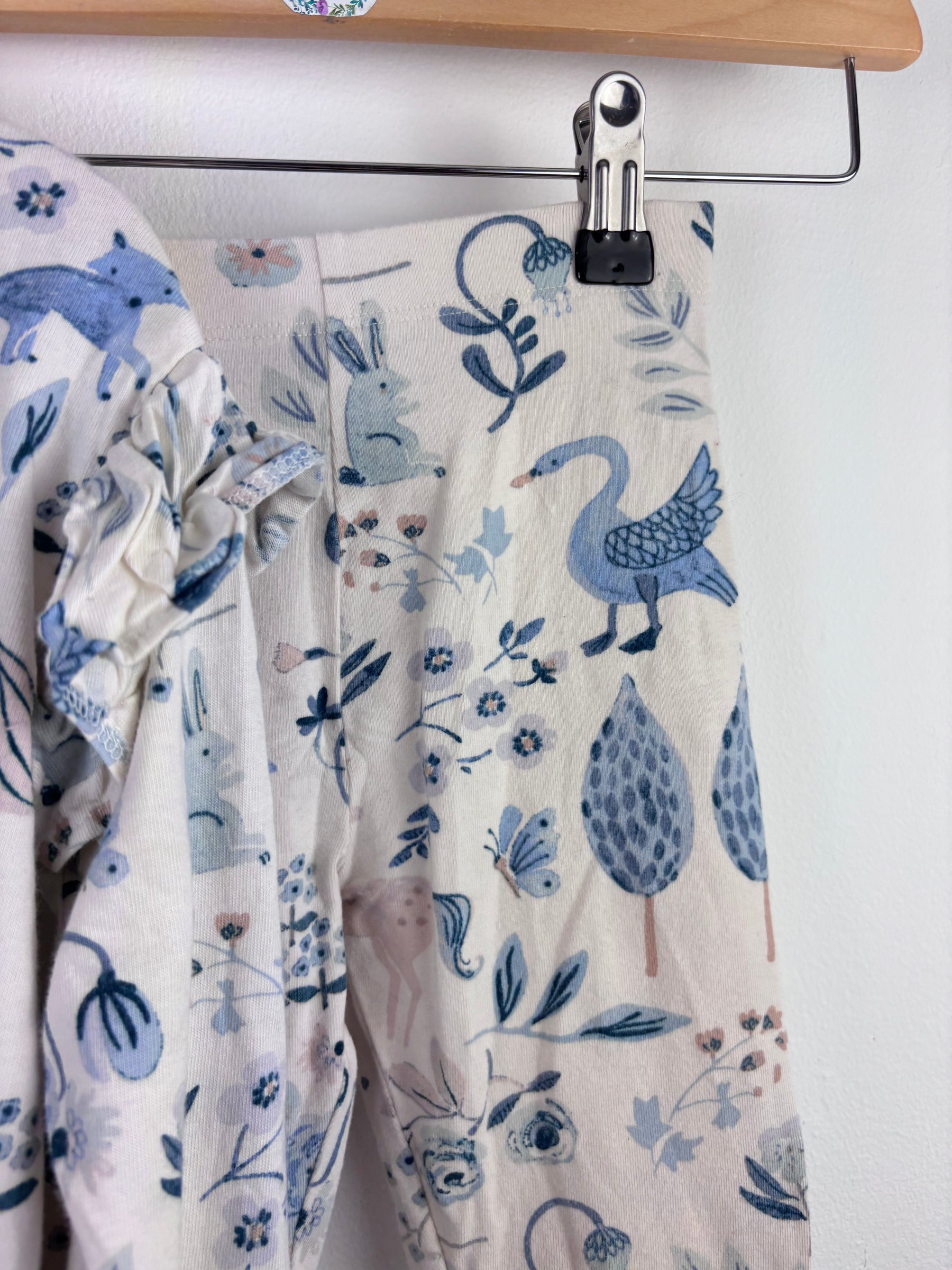 This Next top and leggings set in size 3-4 years is in good condition with a small mark. It features a woodland animal and tree print in soft cream and blue tones with ruffle shoulder detail. Made from cosy cotton, it’s perfect for play or lounging. This preloved set is a sweet second hand find for everyday comfort. Fun, soft and easy to wear, it’s ideal for children who love nature-inspired prints and comfy, sustainable fashion.