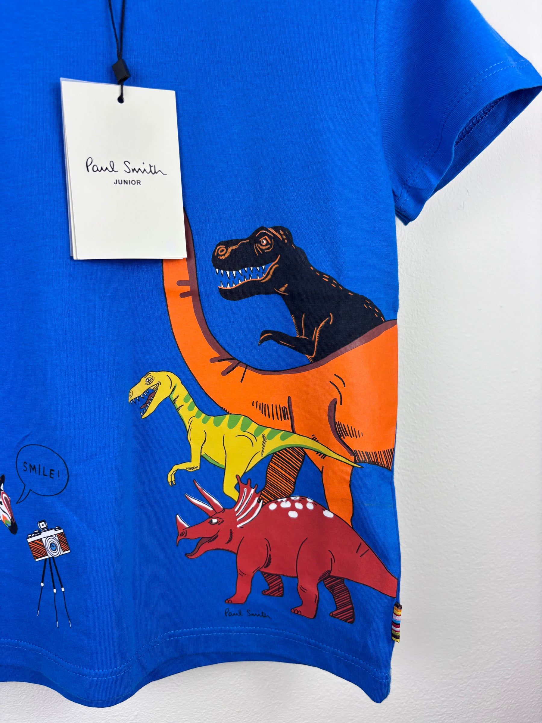 This bold blue Paul Smith Junior T-shirt features a fun dinosaur print alongside the brand’s signature zebra taking a photo. Made from premium soft cotton, it’s lightweight and comfy for everyday wear. The bright colours and playful design make it a standout piece for any wardrobe. This preloved designer tee adds both quality and quirkiness to casual outfits. A brilliant second hand find that brings creativity and fun to dressing up.