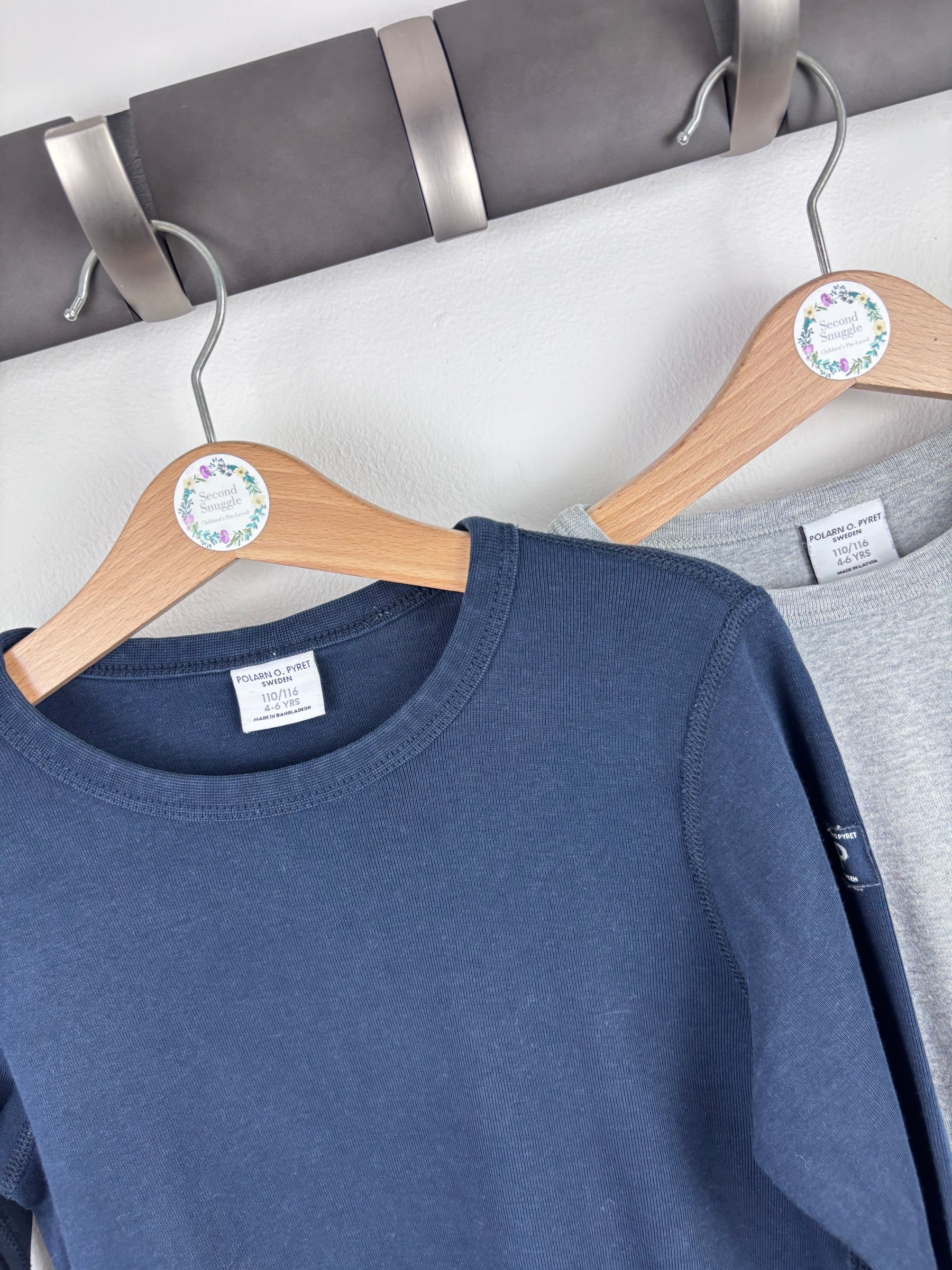 This lovely two-pack from Polarn O. Pyret includes one navy and one grey long sleeve top. Made from soft organic cotton, they’re perfect for layering on cooler days or wearing alone for playtime. The quality fabric feels comfortable and washes brilliantly, keeping its shape and colour wear after wear. These preloved tops are ideal wardrobe basics that pair easily with jeans or joggers. A great second hand find from a trusted sustainable brand that values comfort, durability, and timeless Scandinavian style.