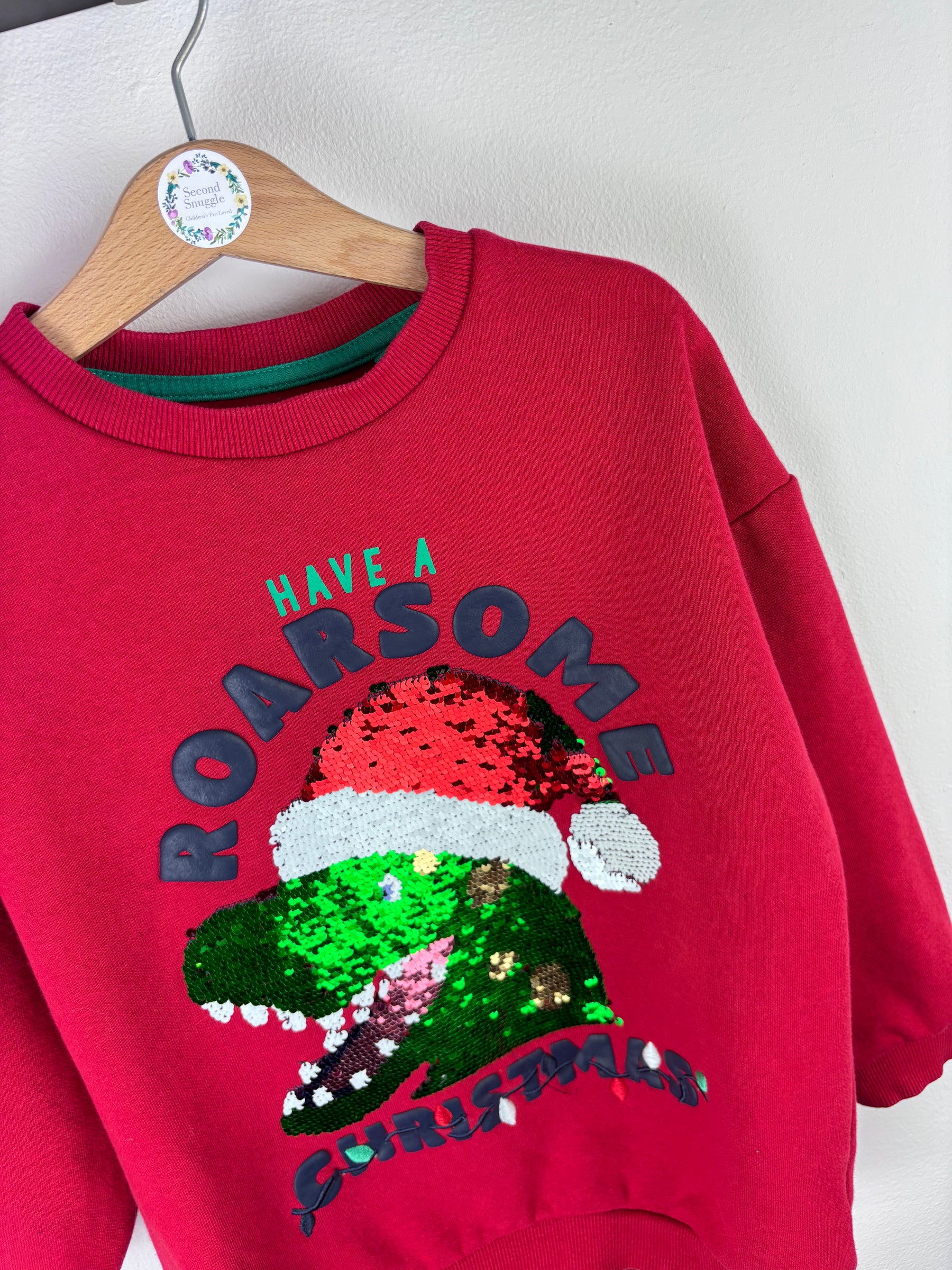 This Fred & Flo jumper in size 5-6 years is in very good condition with a small mark noted. Featuring a red background and sequin dinosaur wearing a Santa hat, it reads “Have a Roarsome Christmas.” It’s a soft, warm piece that’s ideal for festive celebrations or school jumper days. This preloved item is a fun second hand choice for children who love dinosaurs and Christmas. Bright, comfortable and full of personality, it’s sure to bring smiles all season.