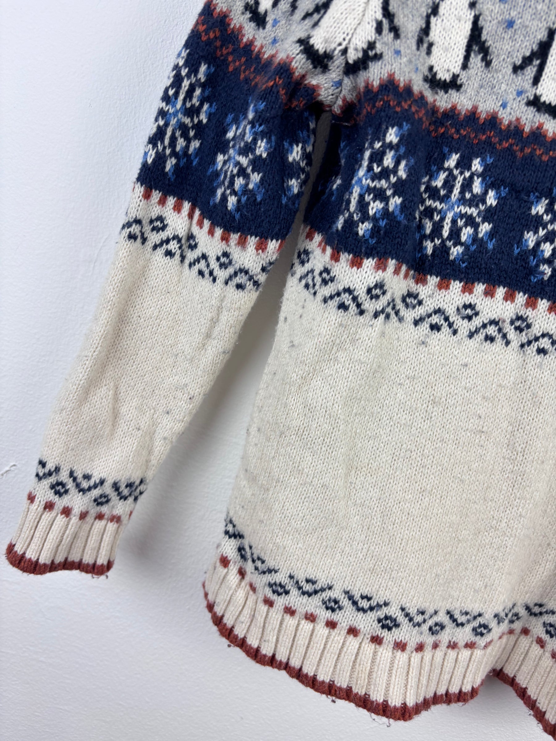 This charming John Lewis jumper in good condition features a sweet penguin and snowflake design. Made from a warm wool blend, it has a zip neck for easy dressing and ribbed edges for comfort. Ideal for winter days and festive wear, it brings classic style and softness together. Though second hand, it’s well cared for and ready for plenty more use. A lovely preloved knit that’s perfect for keeping cosy and stylish while shopping sustainably for quality children’s clothing.