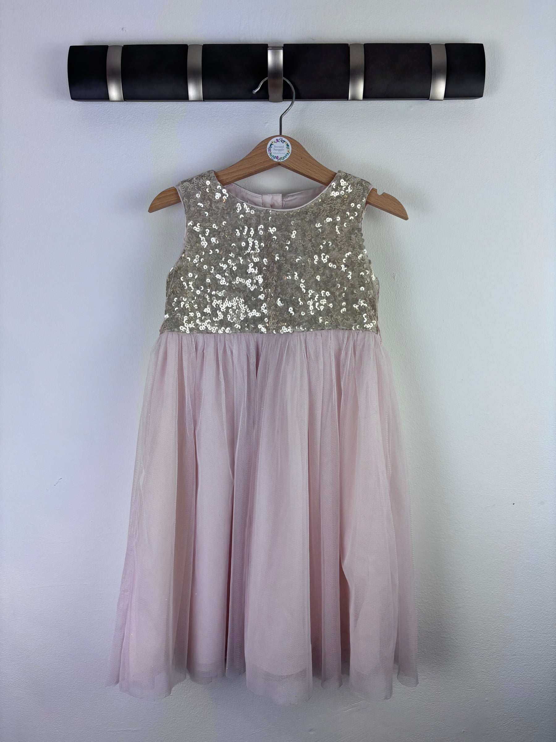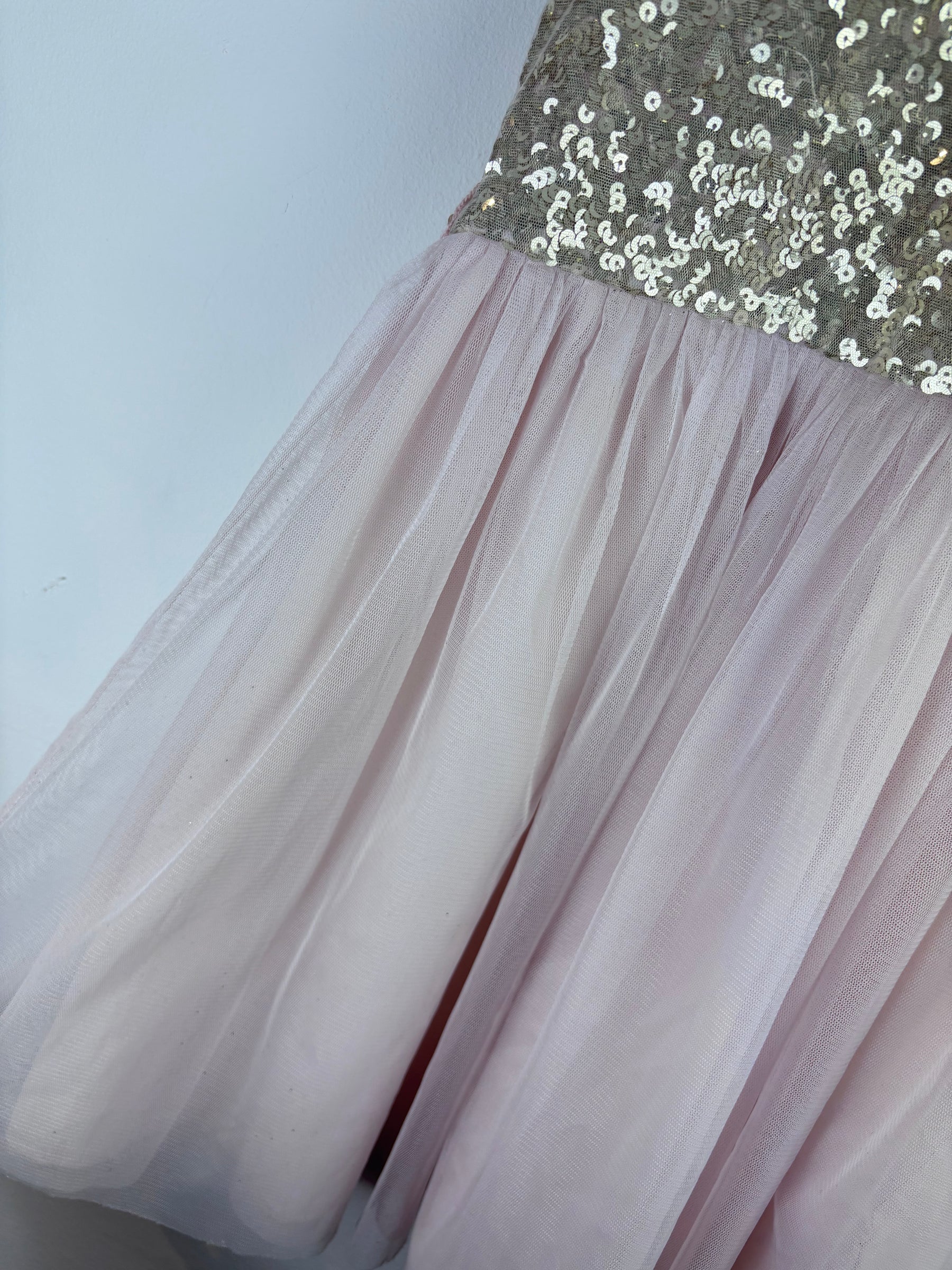 This Monsoon dress in size 2-3 years is in very good condition. It features a soft pink tulle skirt with a sparkly sequin bodice, perfect for parties or special occasions. The lightweight fabric and pretty design make it both comfortable and elegant for little ones to wear. This preloved dress is a beautiful second hand find that adds a touch of sparkle to any children’s wardrobe. Ideal for weddings, birthdays or celebrations, it’s a timeless piece that’s sure to make your child feel special.