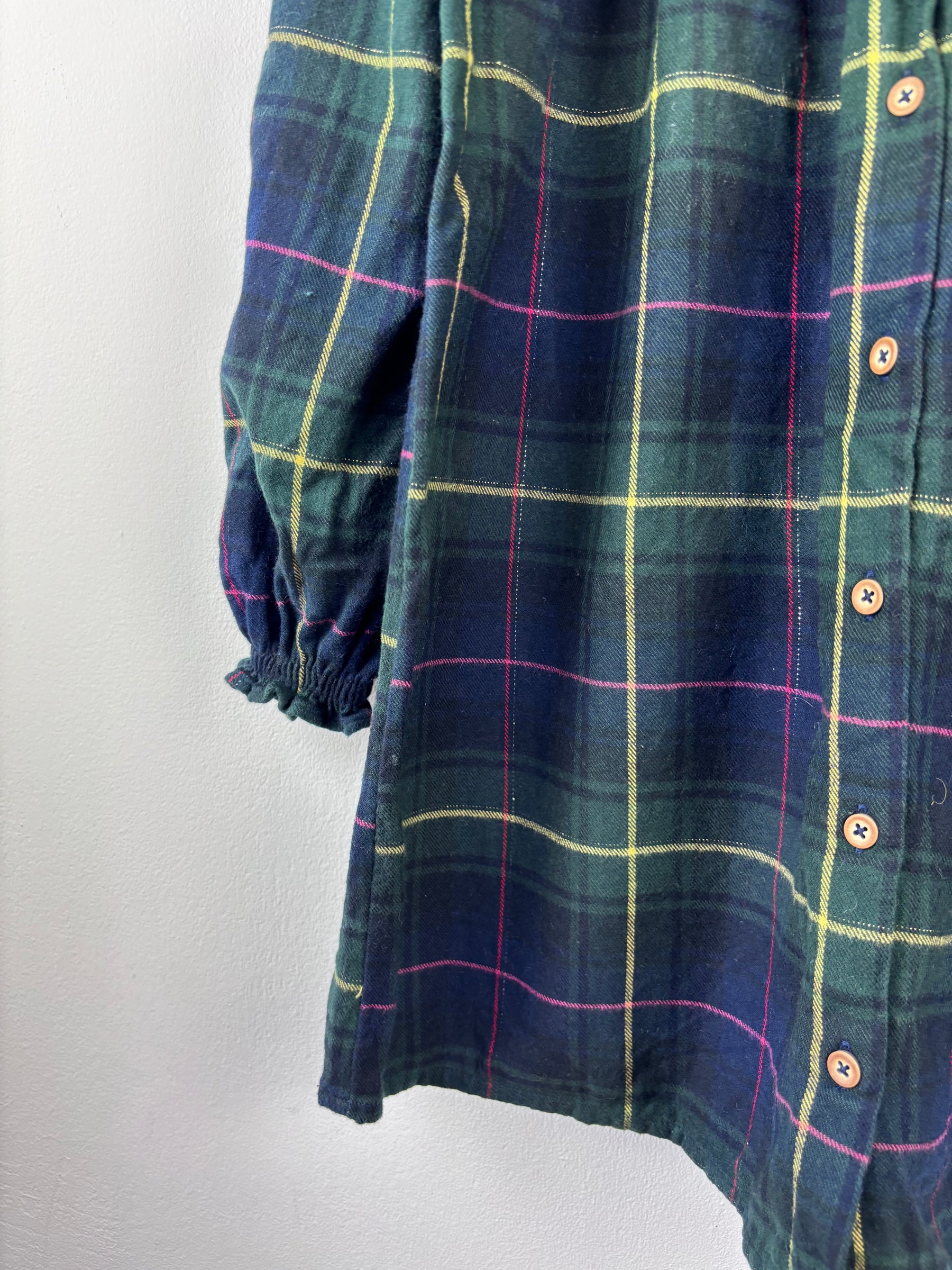 This lovely Next dress features a navy and green check pattern with pink detailing and a delicate lace collar for a classic touch. Made from soft brushed cotton, it’s warm, cosy and ideal for cooler days. Wooden-style buttons run down the front, giving it a timeless look that’s perfect for layering with tights and boots. In very good condition, this preloved dress is a charming second hand piece that combines comfort, quality and traditional style, making it a lovely choice for autumn and winter wear.