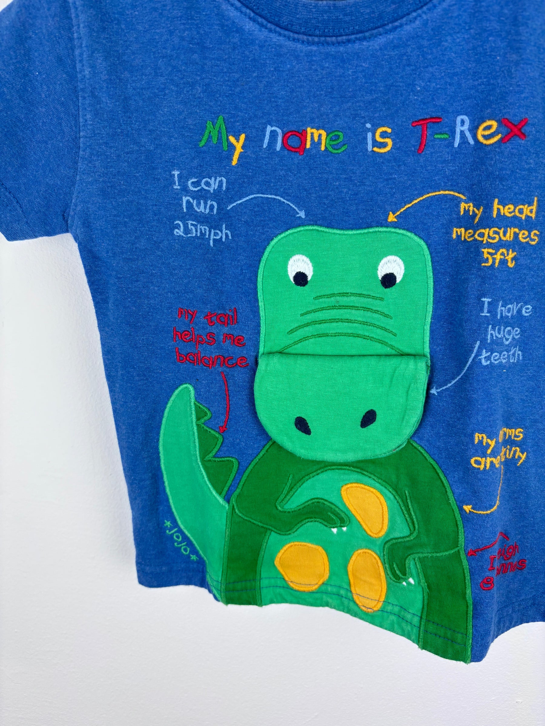 This JoJo Maman Bébé T shirt is bright blue and features a friendly dinosaur design with fun stitched details. The playful writing makes it extra eye catching and perfect for little ones who love dinosaurs. Made from soft cotton, it is easy to wear for everyday adventures and comfy enough for play. This second hand T shirt is in very good condition, showing little sign of previous use. Preloved children’s clothing like this combines character with value, making it a sustainable choice for growing kids. A fun top for any dino fan.