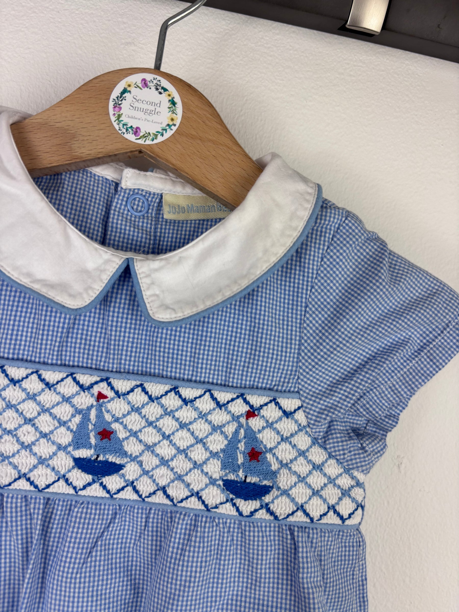 This JoJo Maman Bébé romper in blue gingham is decorated with sweet sailboat embroidery across the chest. Designed with a crisp white collar and gentle elastic at the legs, it has a classic style while keeping little ones comfortable. The lightweight fabric makes it ideal for warmer days or layering with knitwear. This second hand romper is in very good condition and ready for more wear. Preloved baby clothing like this is a lovely way to find quality while shopping sustainably. A charming outfit choice for tiny sailors.