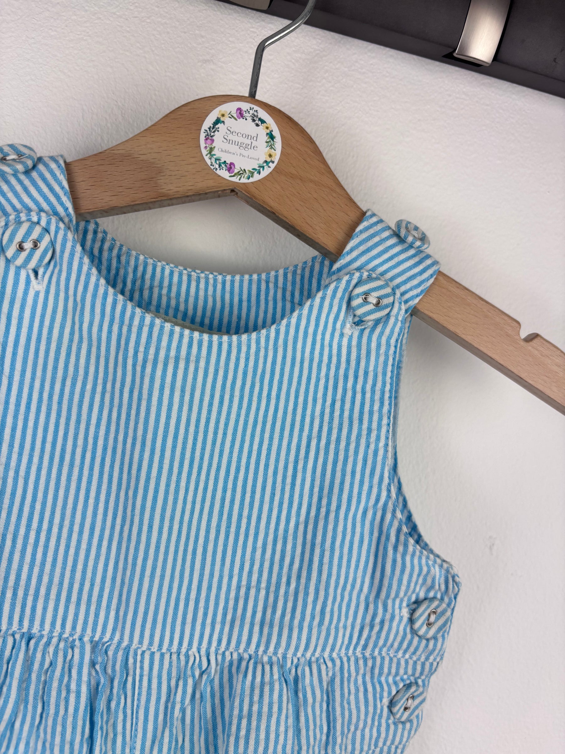 This JoJo Maman Bebe romper is in very good condition and comes in a light blue stripe with front pockets. Designed with button fastenings at the shoulders and elasticated legs, it makes dressing and changing easy. The lightweight cotton fabric is comfy for babies, keeping them cool in warmer weather. Choosing preloved baby clothing is a sustainable way to dress little ones while still enjoying trusted brands like JoJo Maman Bebe. This second hand romper is a sweet, practical piece for everyday wear or special occasions.