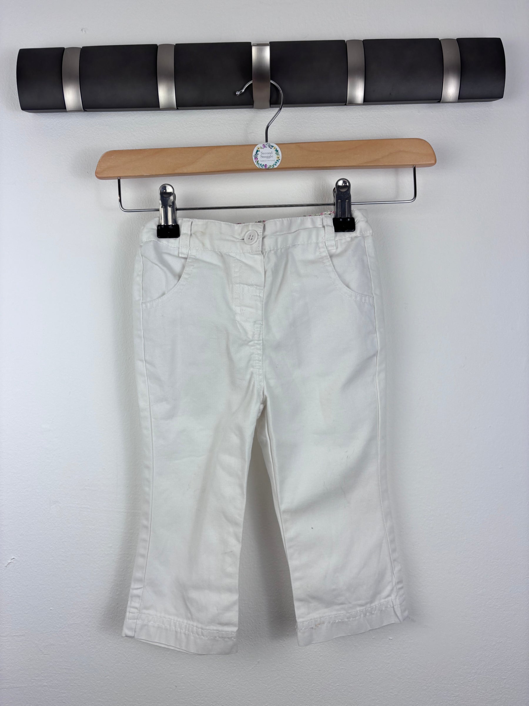 This pair of JoJo Maman Bébé trousers in size 12-18 months is in good condition with a small mark shown. They are white cotton with front pockets and a button fastening, perfect for warmer weather or special occasions. The fabric is breathable, making them ideal for children to wear comfortably. They can be dressed up with a smart shirt or paired with a casual top for everyday style. This is a second hand clothing piece that still has plenty of life left. A preloved wardrobe essential for kids’ sustainable fashion.