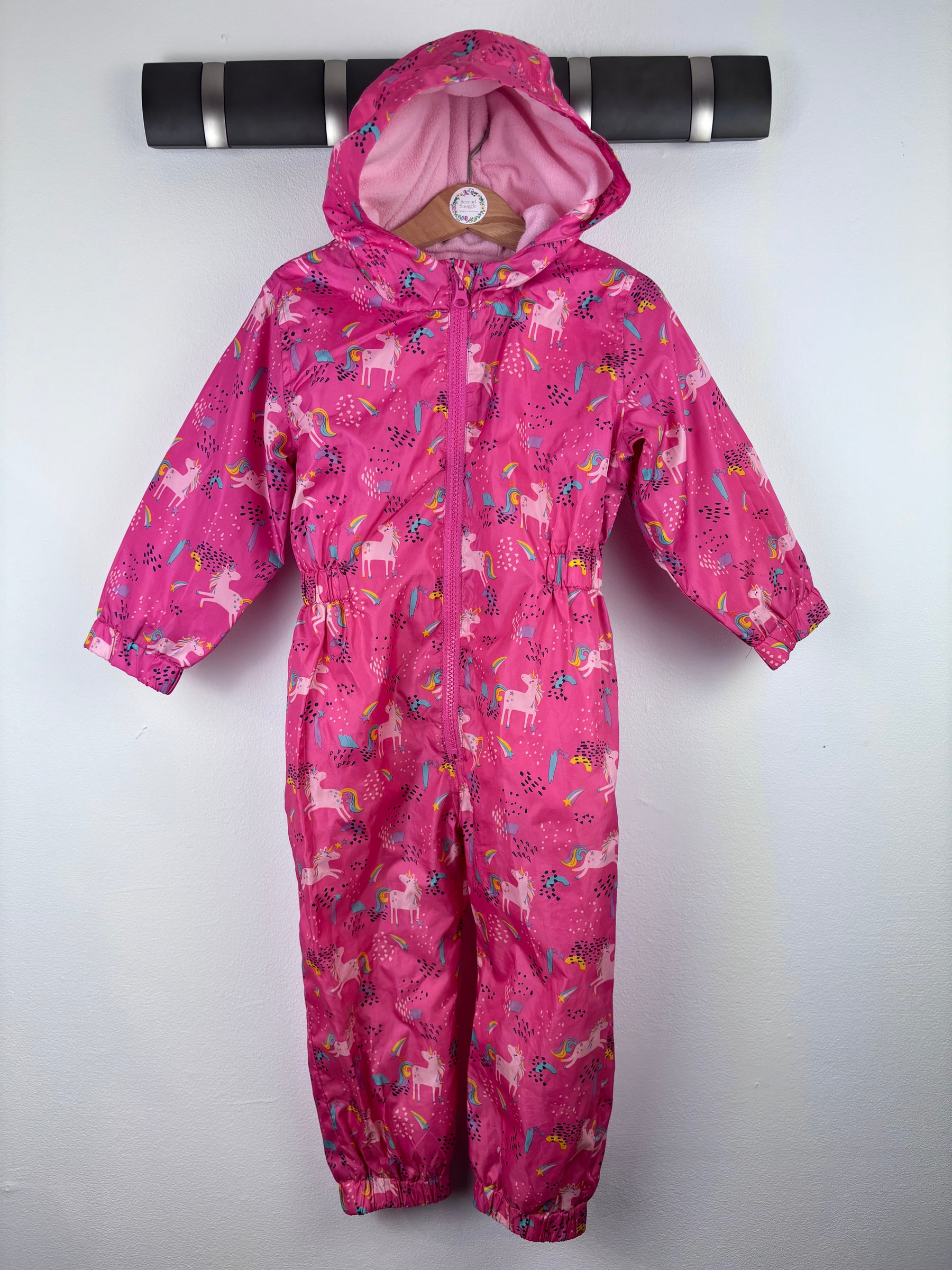 This Matalan puddle suit in size 2-3 years is in very good condition. It features a bright pink background with colourful unicorns, rainbows, and stars. The hooded design and waterproof outer make it ideal for rainy walks or outdoor adventures. The zip front and elastic cuffs keep little ones snug and dry. This preloved all-in-one is a fun and practical second hand piece, keeping playtime magical while staying sustainable and affordable.
