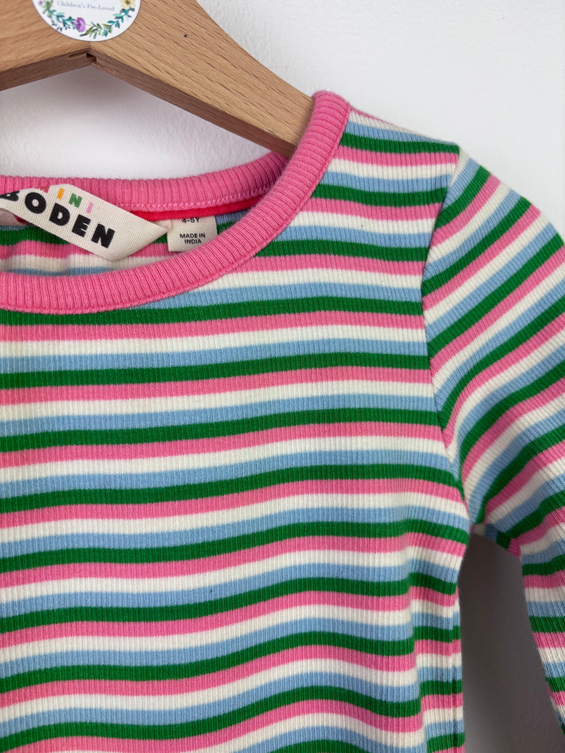 This Mini Boden long sleeve top features a bright stripe pattern in pink, green, and white with a pink trim around the neckline. Made from soft ribbed cotton, it feels comfy and stretchy for everyday wear. The fit is easy and works well for school, nursery, or playtime. It pairs nicely with jeans, leggings, or skirts and is great for layering. This top is new without tags and unworn. A colourful piece for kids fashion and a lovely addition to children’s clothing collections including second-hand and preloved styles.