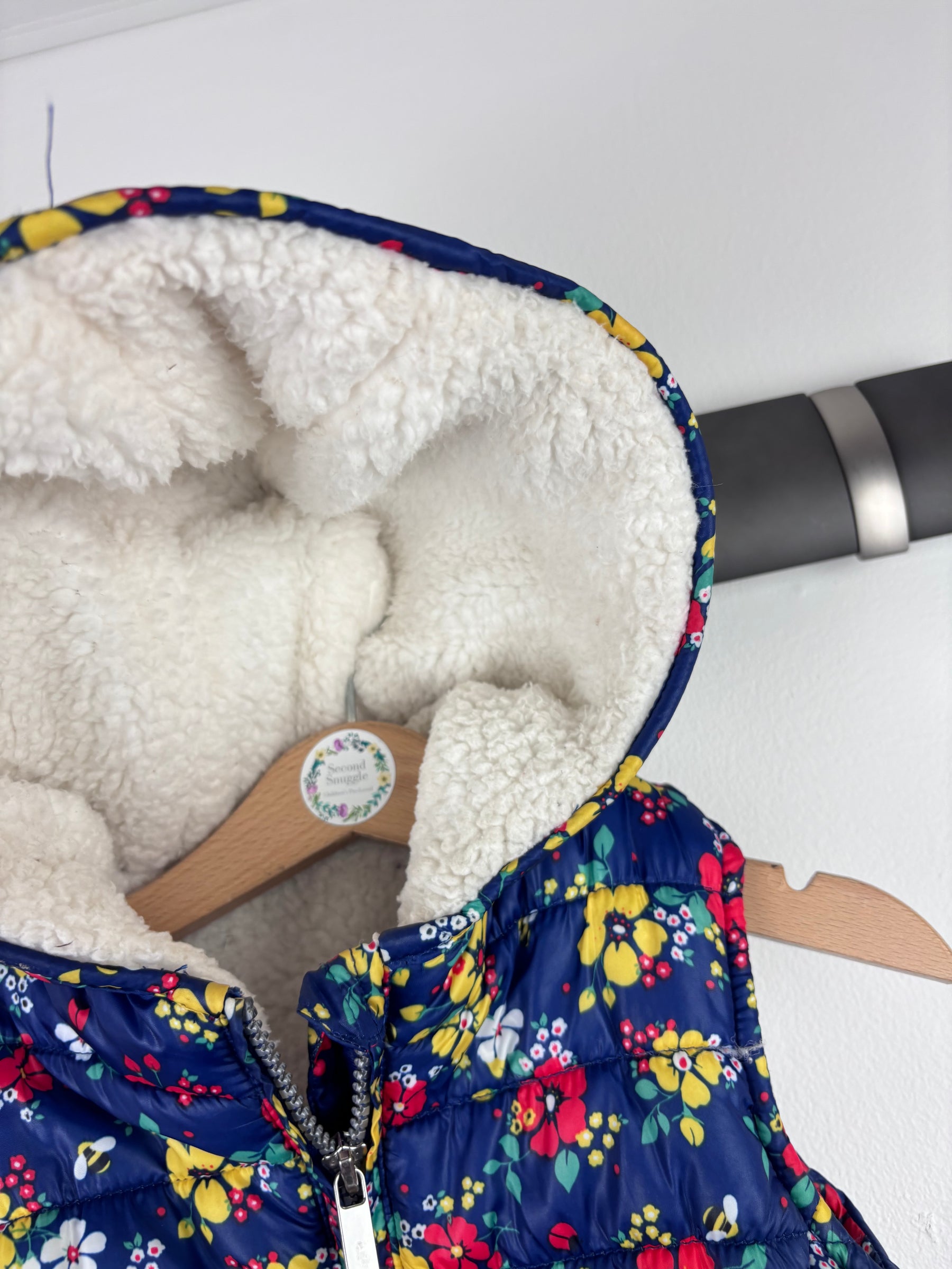 This Mothercare gilet in size 2-3 years is in very good condition. Featuring a navy base with bright floral prints, it’s fully lined with cosy sherpa fleece for extra warmth. Perfect for layering over jumpers or hoodies on cooler days. Lightweight yet warm, this preloved gilet is a lovely second hand find for autumn and winter. Ideal for children who love comfort and colour in their everyday adventures.