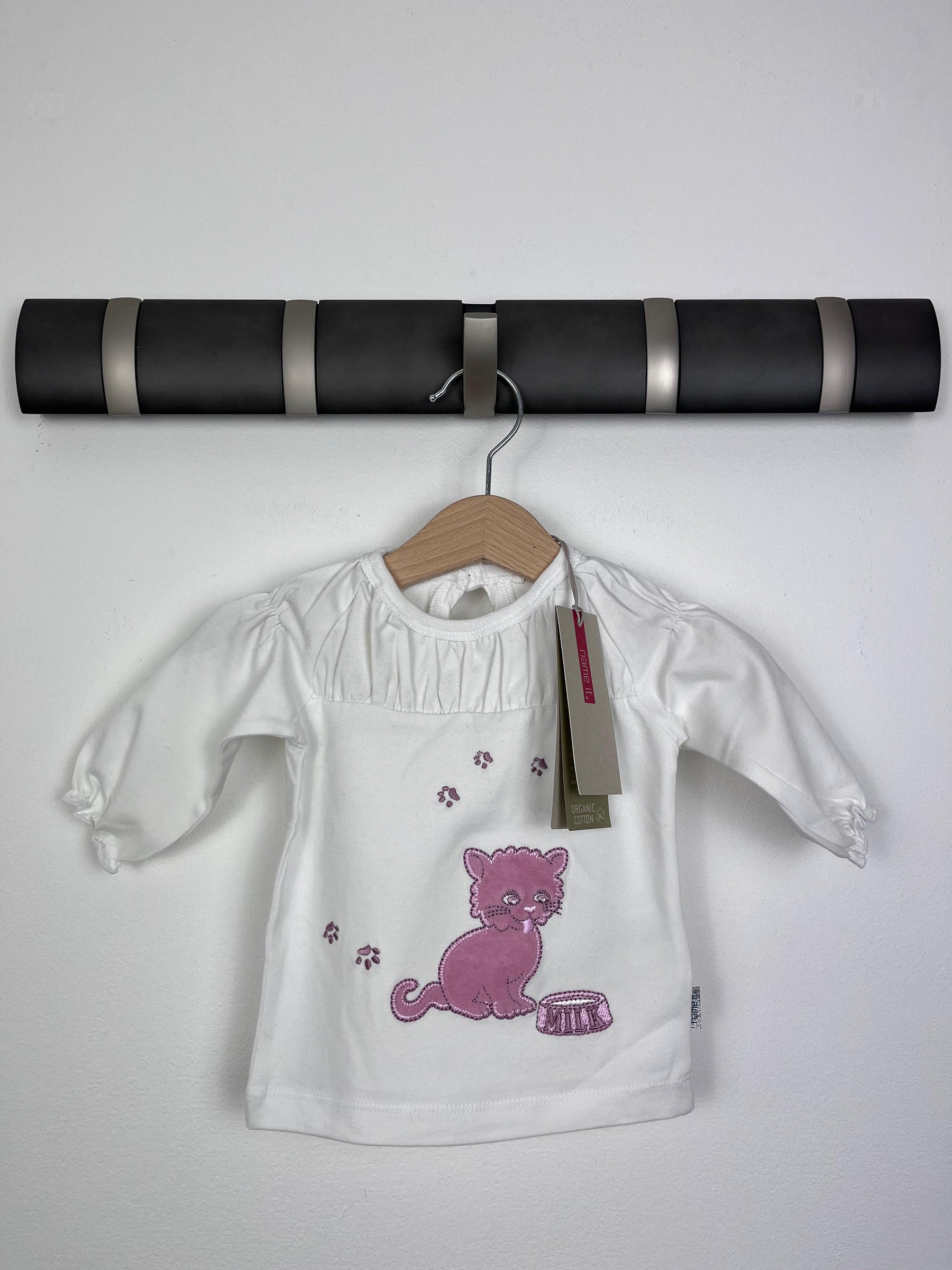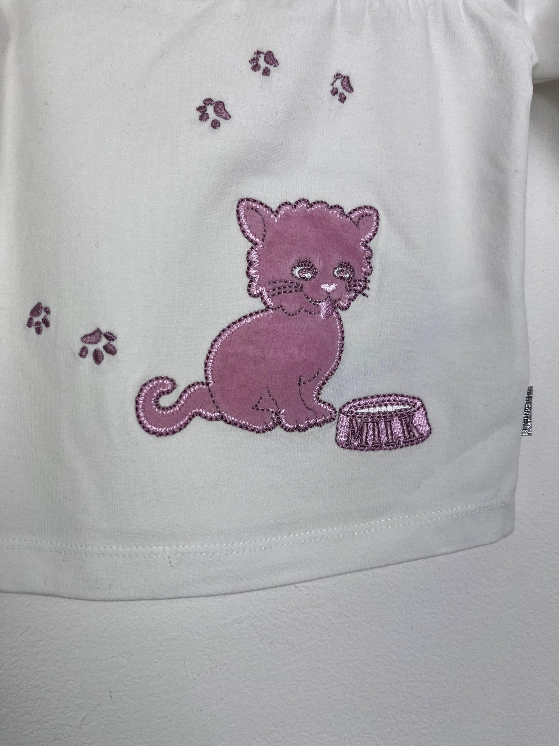 This sweet long sleeve top from Name It comes in soft white cotton with a pretty pleated neckline. It has a cute pink cat design on the front with little paw prints for extra detail. The fabric is gentle and comfy for baby skin, making it perfect for everyday wear. Brand new with tags, it is fresh and ready for its first little owner. A lovely choice for pairing with leggings or jeans. This second hand and preloved baby fashion piece is ideal for children who need comfort and style.
