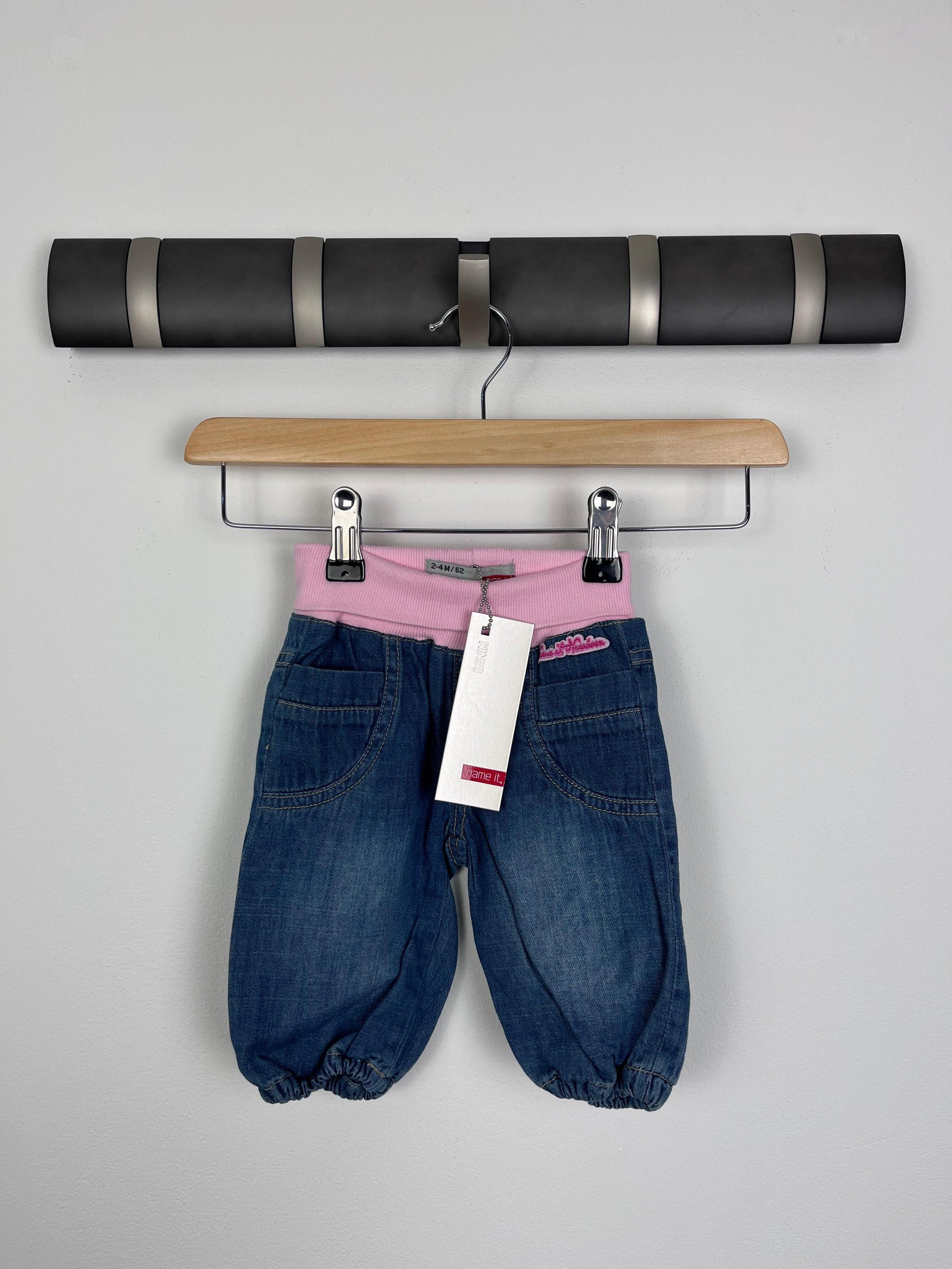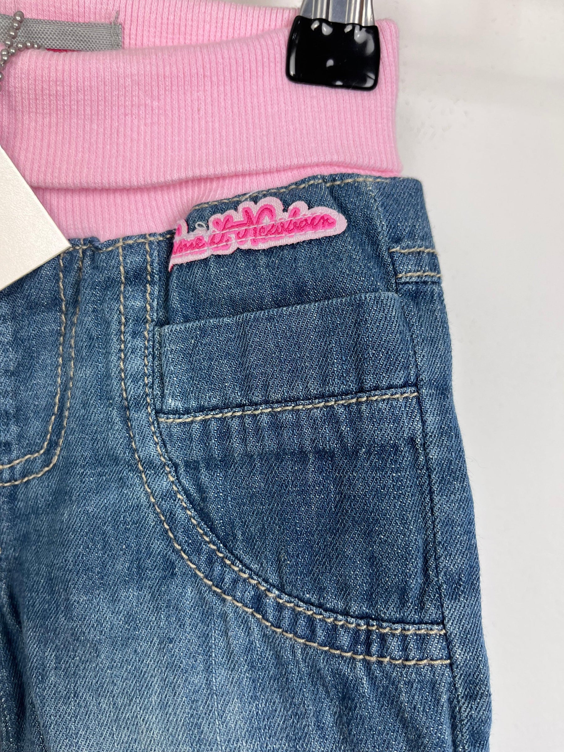 These Name It baby denim trousers are brand new and come with their tags still attached. They feature a soft pink ribbed waistband for extra comfort and an easy fit, with gathered hems that keep the trousers snug. Two front pockets give them a stylish finish while keeping the design practical. The denim is soft and made to move with little ones, great for play or outings. These trousers are a lovely staple for any baby wardrobe. A second hand option like this preloved fashion piece is perfect for babies and children.