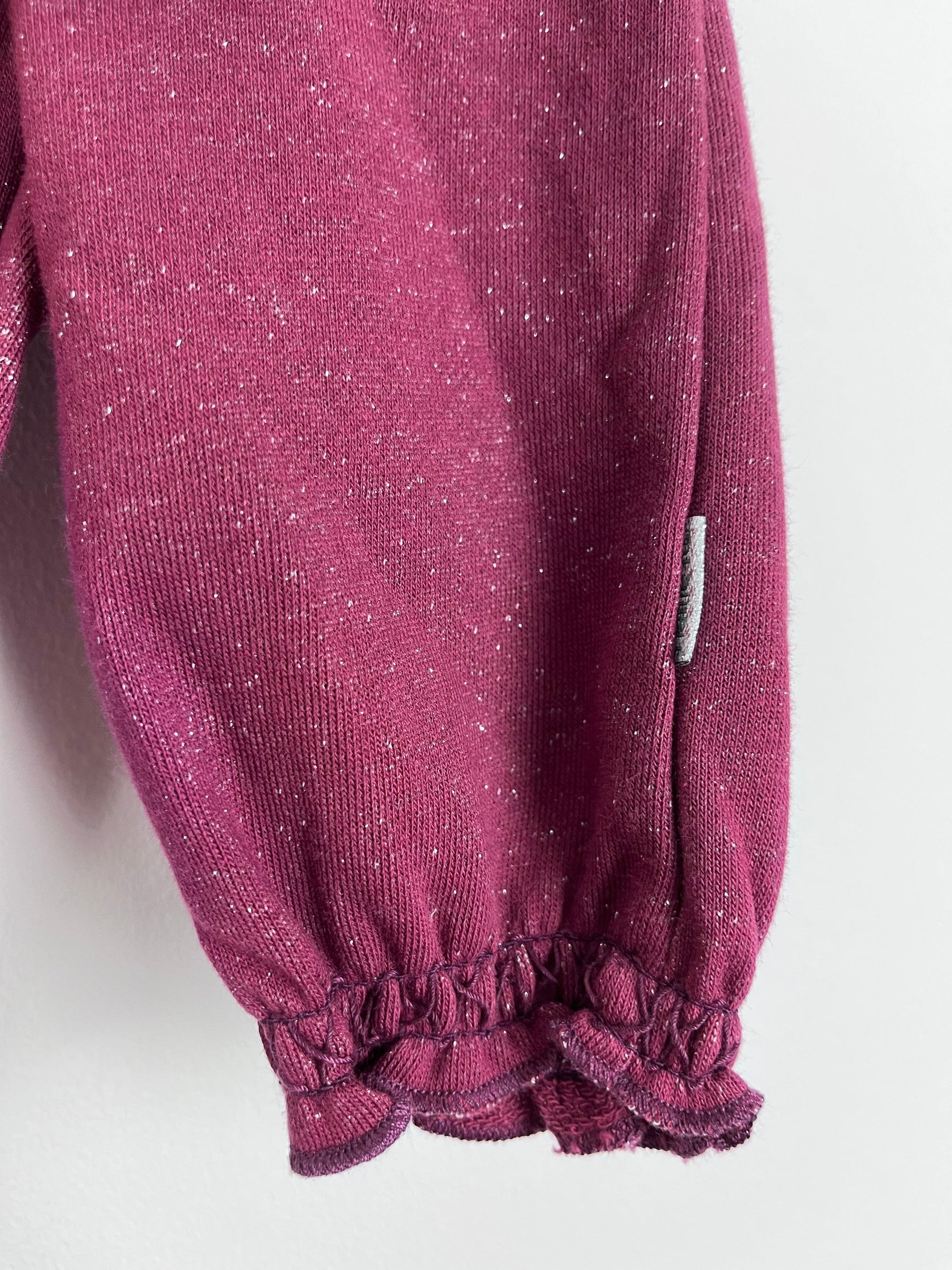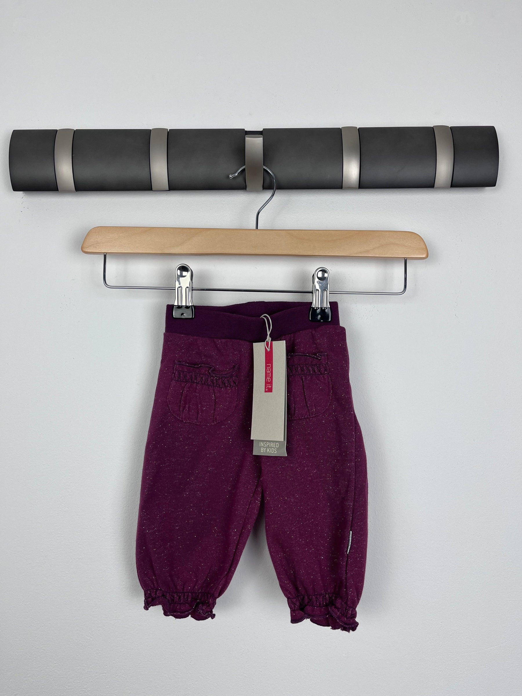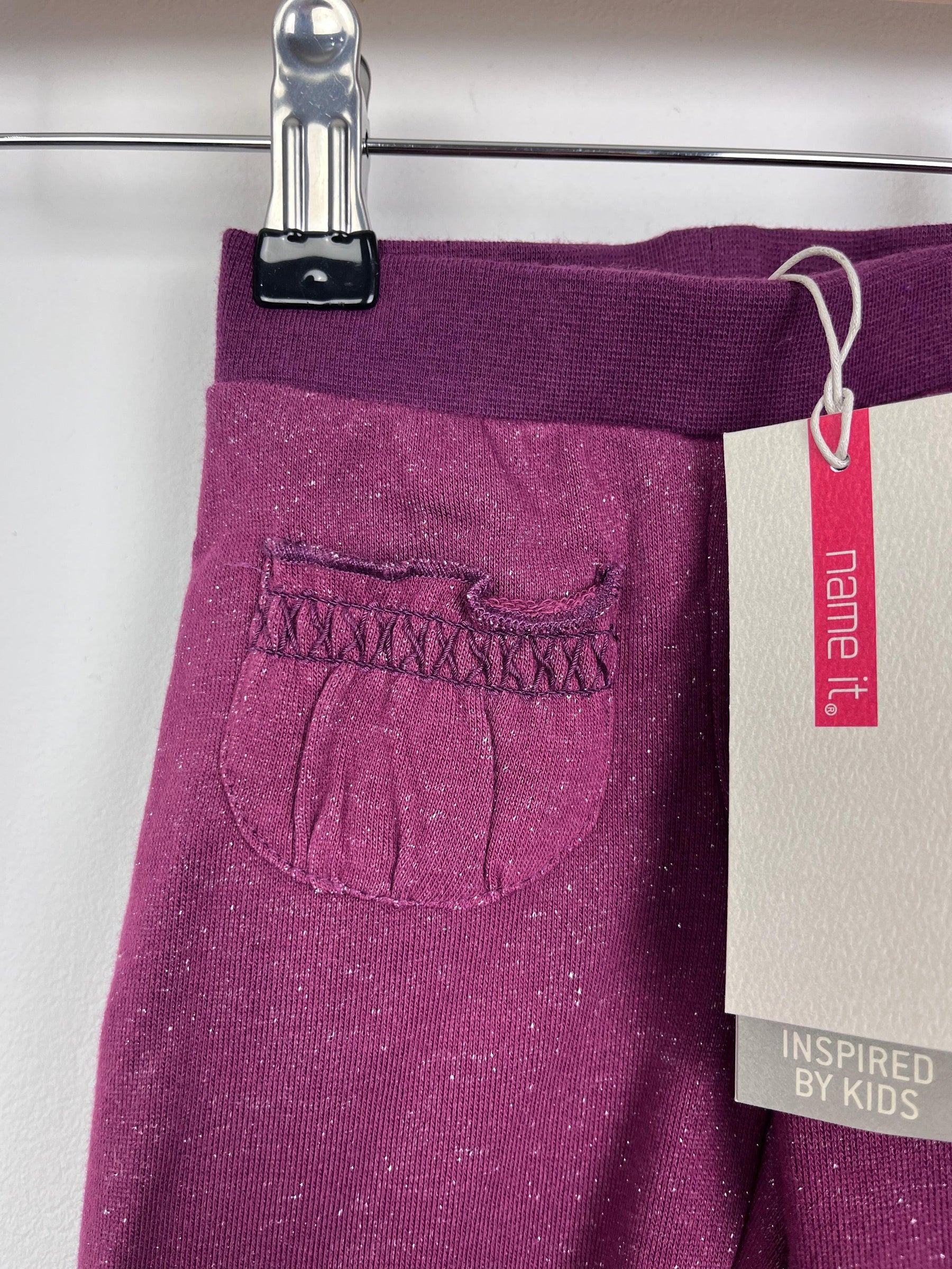 Brand new with tags, these Name It trousers are a lovely choice for babies. They come in a deep purple shade with a subtle sparkle through the fabric, giving them a fun look. The waistband is soft and stretchy, making them easy to wear, while the elasticated hems give a neat finish. Small pockets on the front add extra charm. These trousers are comfy yet smart enough for outings, and will pair well with lots of tops. A second hand find like this preloved baby fashion piece brings style to children’s clothing.