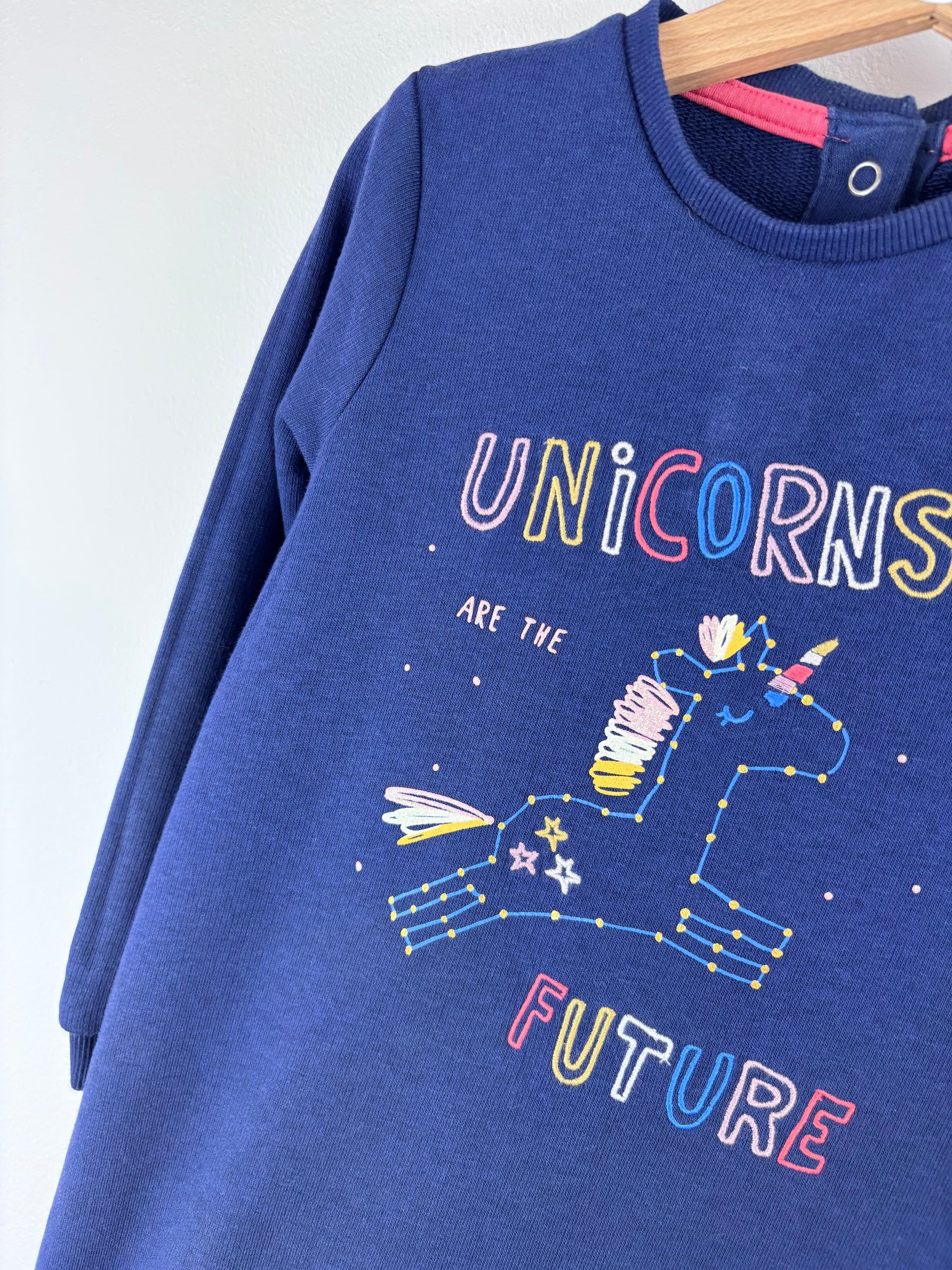This M&S long sleeve dress in size 3-4 years is in excellent condition. Made from soft navy cotton, it features a fun unicorn design with the words “Unicorns are the future” printed on the front. The cosy sweatshirt material makes it perfect for cooler days, while the easy pull-on style adds comfort and practicality. This preloved dress is a charming second hand find that’s ideal for everyday wear. Great for playtime or relaxed weekends, it adds a little sparkle and imagination to any child’s wardrobe.