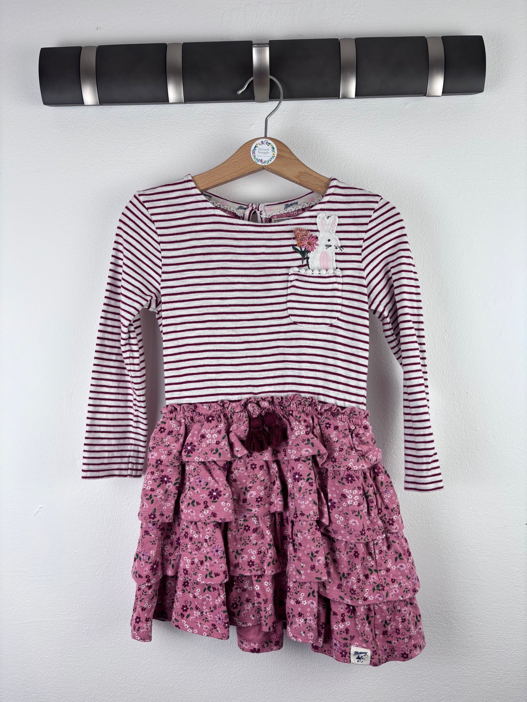 This Mantaray dress in size 3-4 years is in very good condition. The top features maroon and white stripes with a bunny applique and small front pocket, while the skirt has layered floral ruffles. Made from soft cotton, it is comfortable and easy to wear. This preloved dress is a delightful second hand find full of charm and colour. Perfect for everyday adventures or special outings, it captures the fun and quality you’d expect from Mantaray children’s clothing.