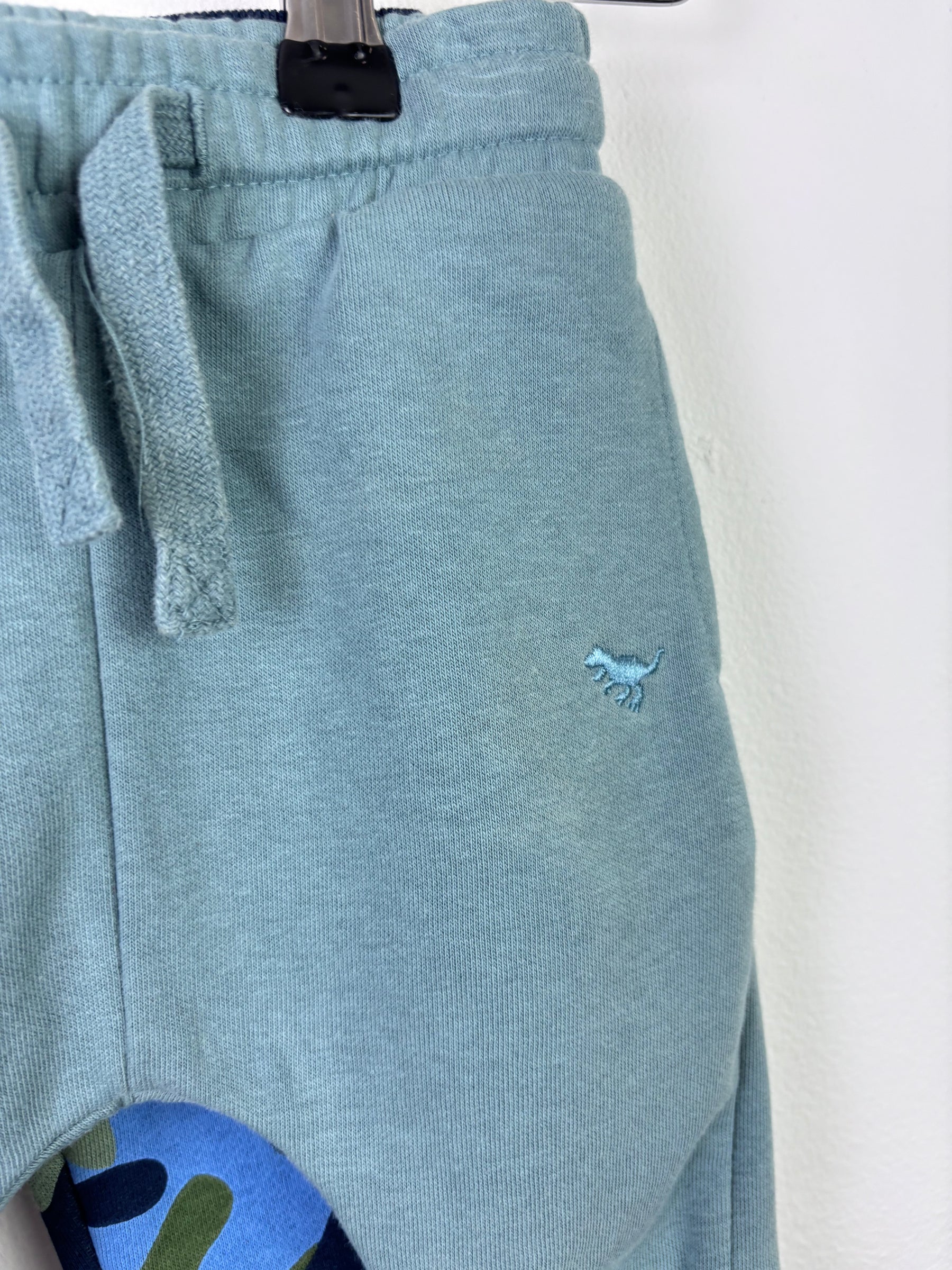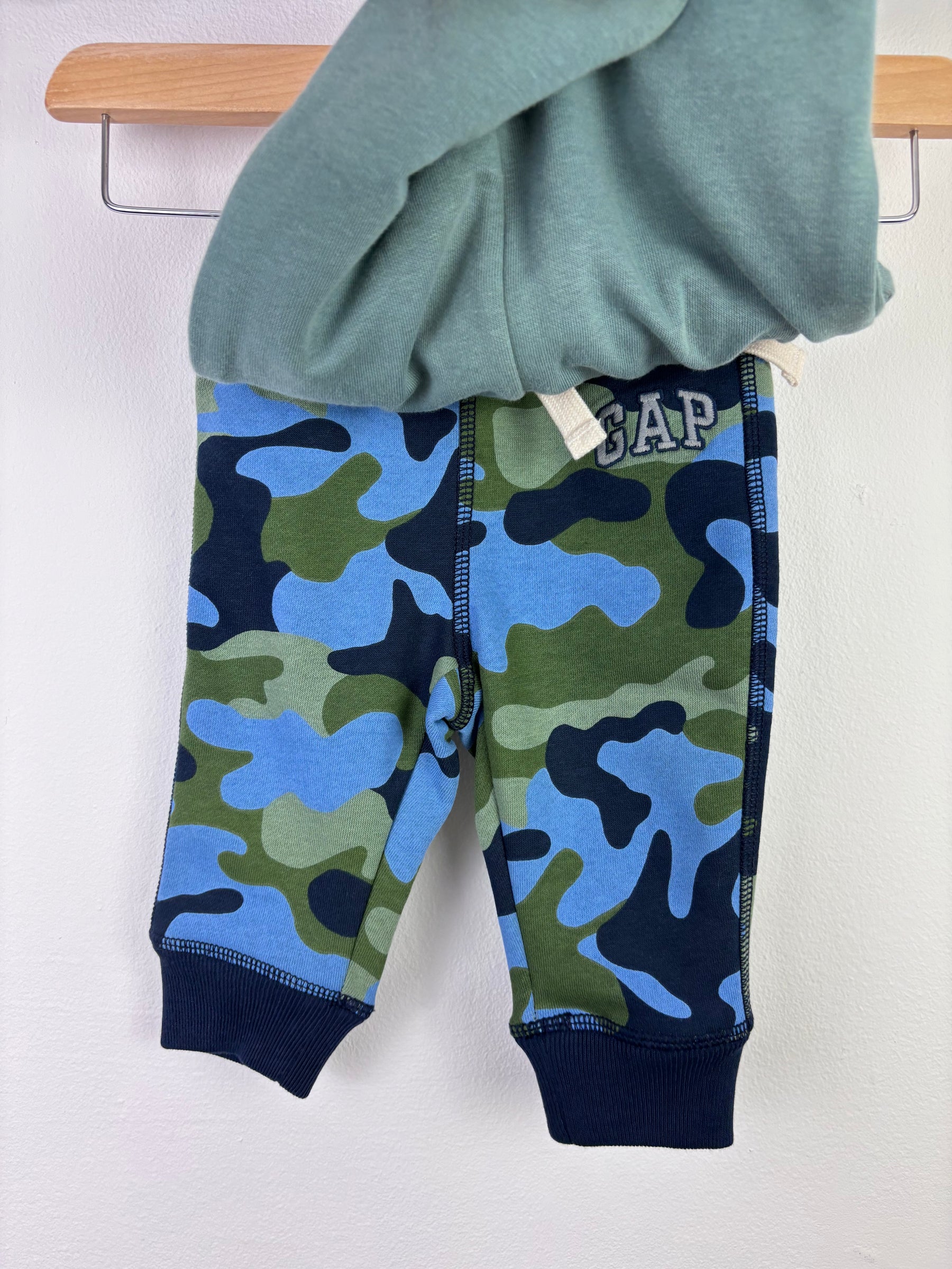 This set includes two pairs of jogger trousers from Gap and Next. One pair comes in a soft muted green shade, while the other features a blue camouflage-style pattern. Both pairs have elasticated waistbands and cuffed ankles, offering comfort and ease of movement. In very good preloved condition. Ideal for everyday wear, playtime or lounging at home, these joggers are practical, comfortable and easy to mix and match with a range of tops.