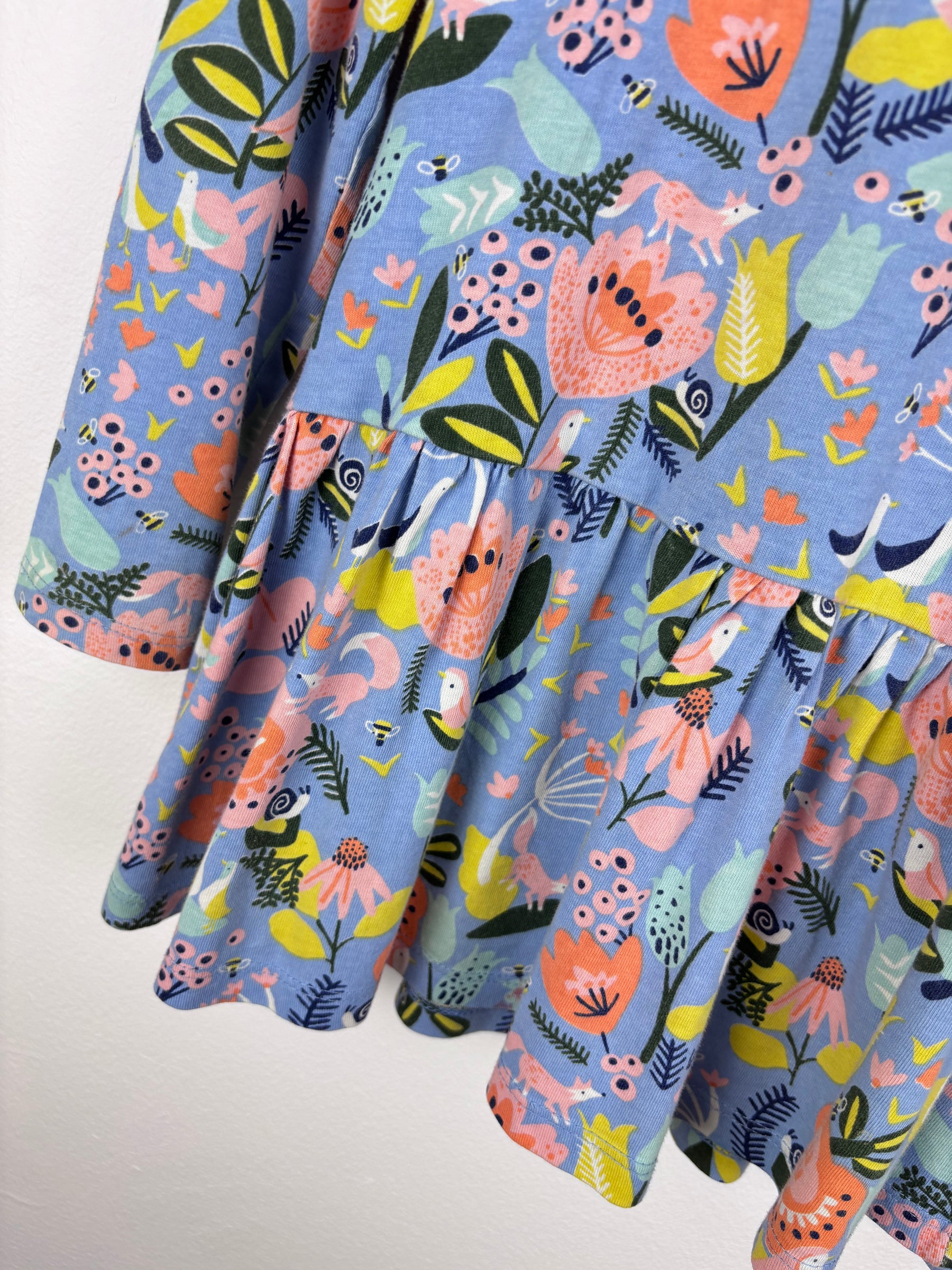 This Mini Club dress has a pretty blue base with bright floral patterns and a peplum style skirt. It has long sleeves and soft cotton fabric that makes it comfy for all day wear. The dress is second hand and in very good condition. It is perfect for everyday outfits or weekend plans. This preloved Mini Club dress is cheerful and simple to style making it a lovely addition to any wardrobe.