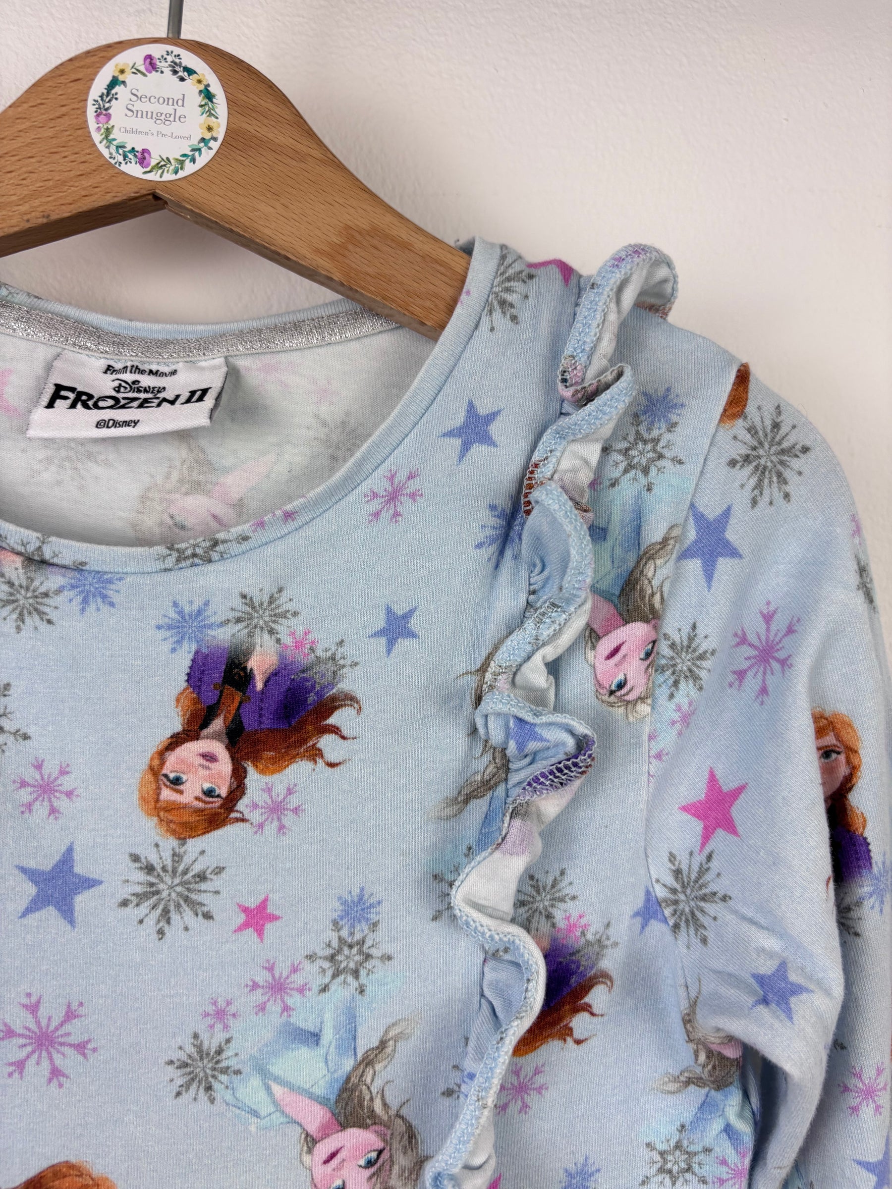 This pretty Disney Frozen dress is in good condition and perfect for any little fan of Anna and Elsa. It has long sleeves, a soft blue colour and fun all over Frozen characters with snowflakes. The fabric feels comfy and easy to wear for everyday play or parties. This second hand dress is great for adding a bit of magic to your child’s wardrobe. It is a lovely choice for kids who love character clothing and simple fashion. This preloved piece still has plenty of life left and is ideal for children who enjoy dressing up.