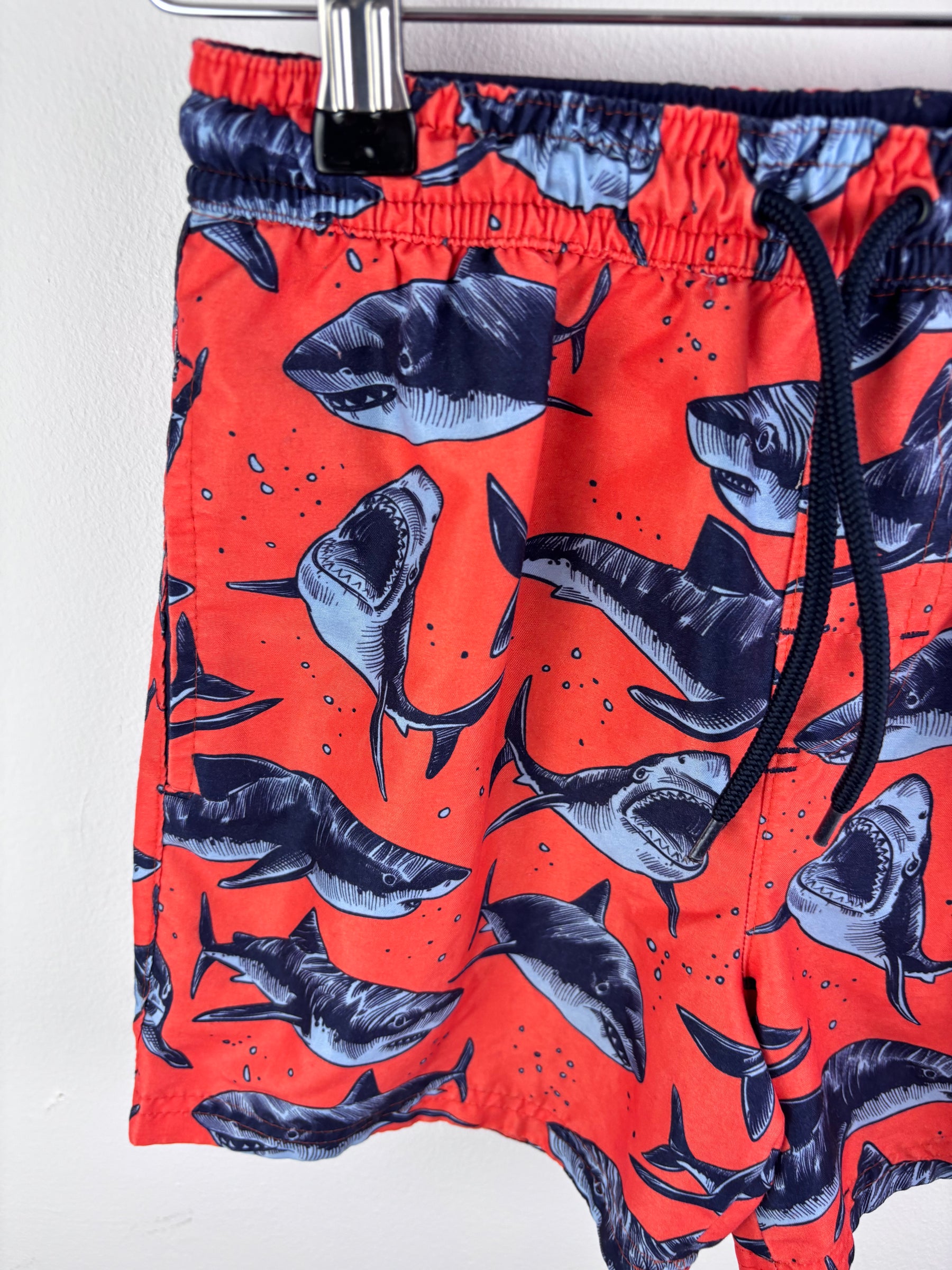 Bright red swim shorts from Next featuring bold shark illustrations throughout for a standout look. Designed with an elasticated waistband and adjustable drawstring for a secure fit. Made from quick-dry fabric, perfect for beach days, swimming, or holidays. Size 9 years. In good condition with general signs of wear. A vibrant and fun swimwear option ideal for active kids who love bold prints.