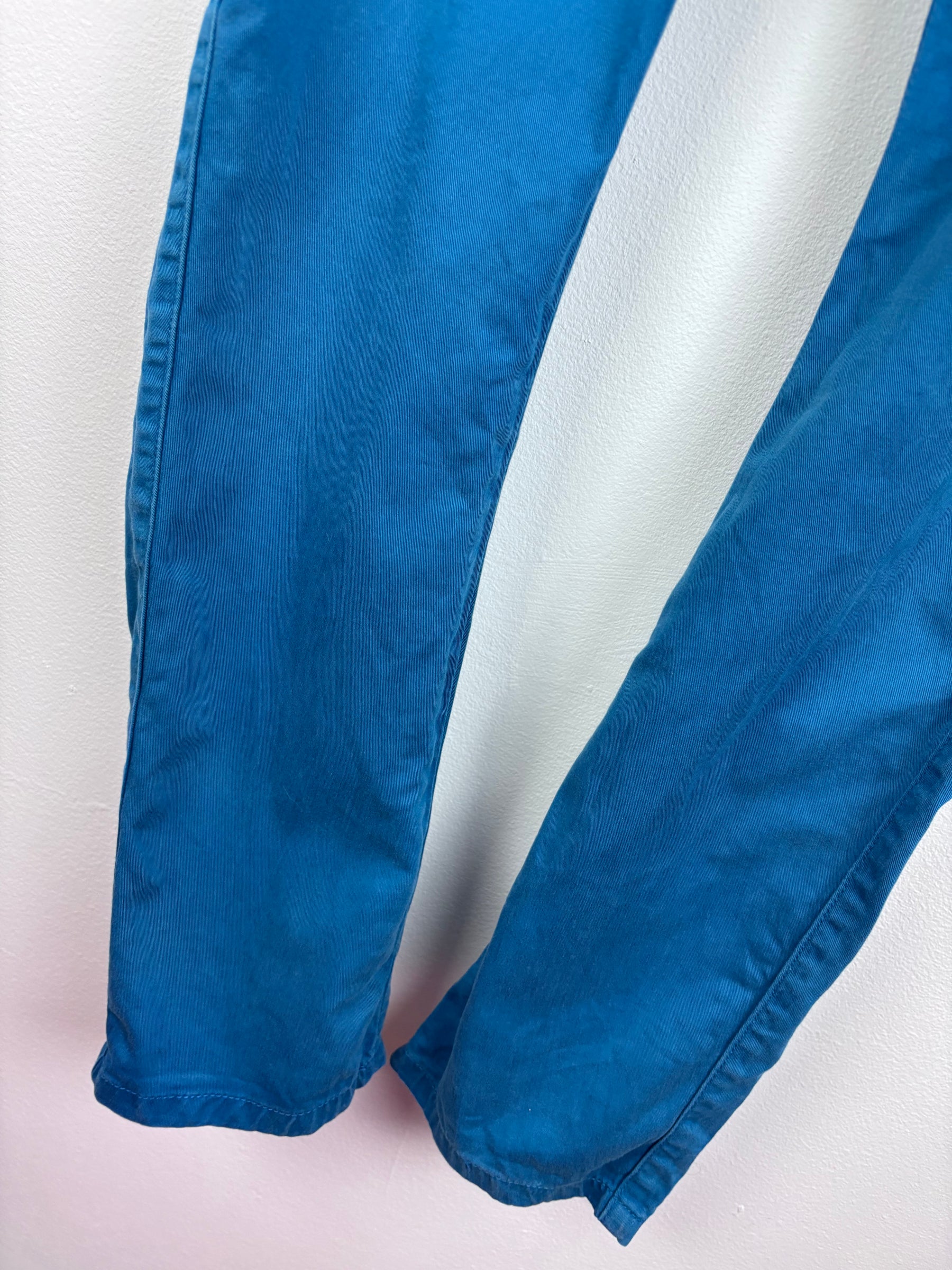 These blue trousers are in good condition and made from soft cotton with a smooth feel. They feature a button fastening, front pockets and a slim straight leg shape that looks smart but still feels comfortable. The fabric is lightweight and easy to wear, making them suitable for everyday outfits or dressed up with a shirt or knit. The brand label is missing, but the quality feels good. This is a second hand item that has been checked for wear. These preloved children’s trousers are practical, versatile and ready for more use.