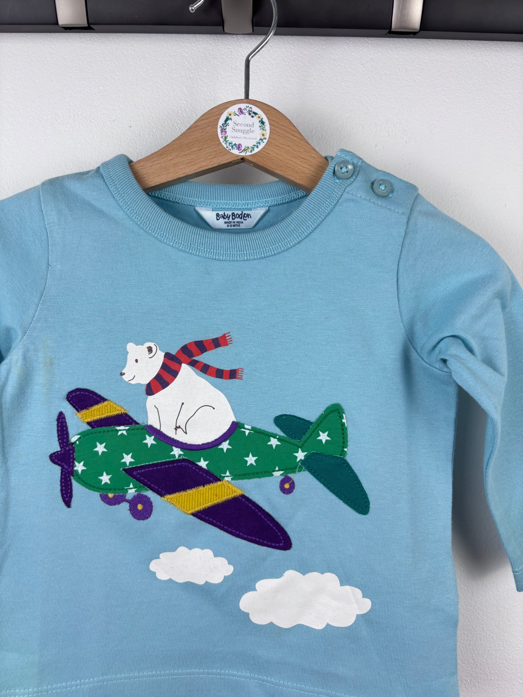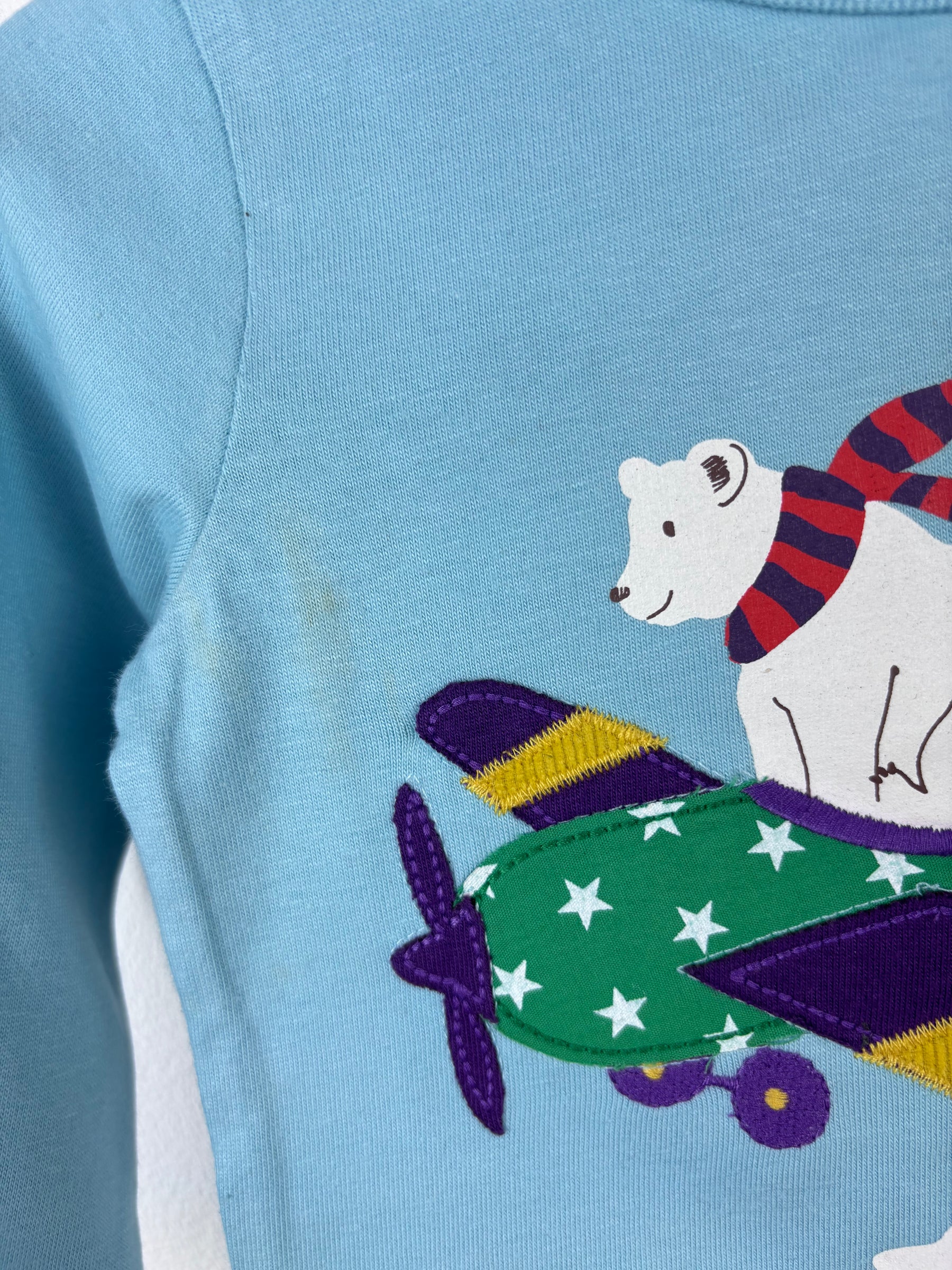 This adorable Baby Boden long sleeve top features a polar bear flying a colourful plane through the clouds. The soft blue cotton is gentle on skin, and the shoulder poppers make changes easy. There’s a small mark shown, but it doesn’t take away from its lovely design. This preloved top is a wonderful second hand piece full of Boden’s playful charm. Perfect for everyday wear or layering under dungarees during cooler weather.