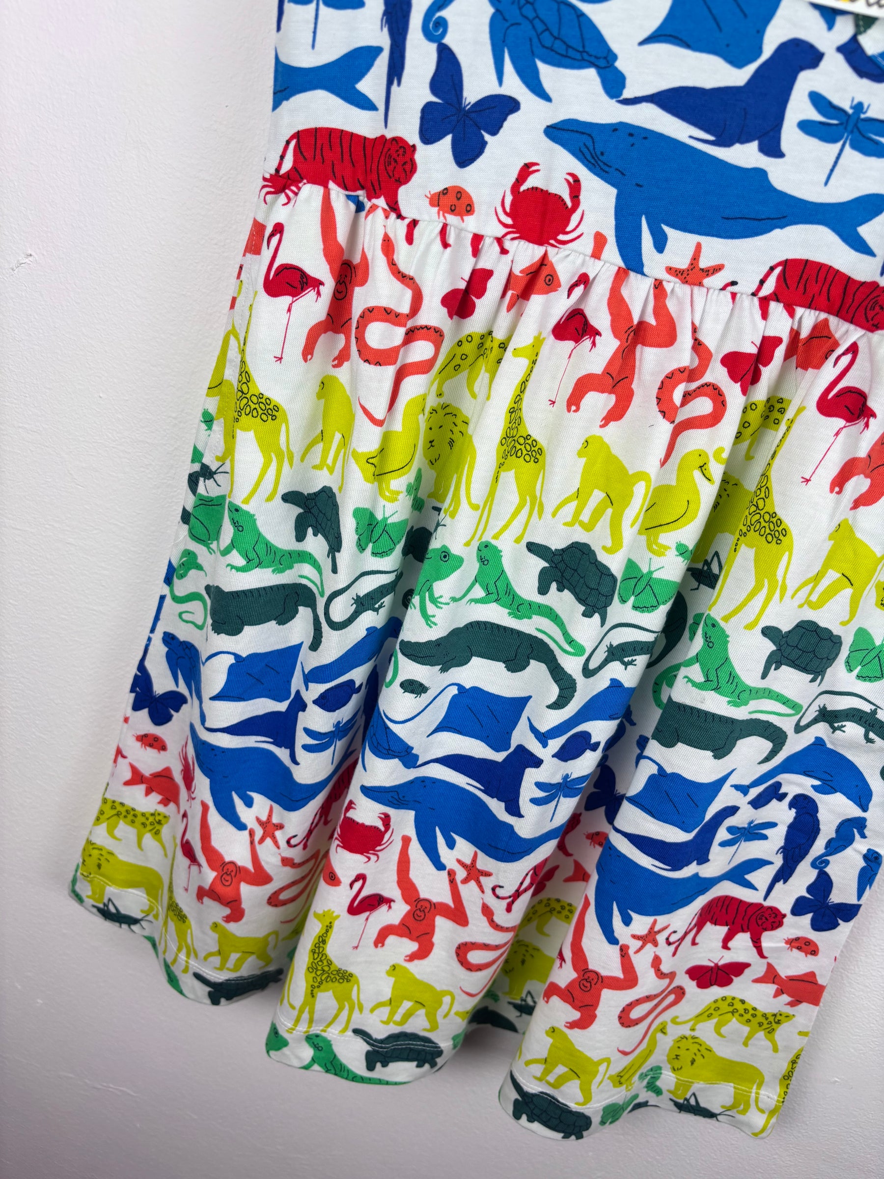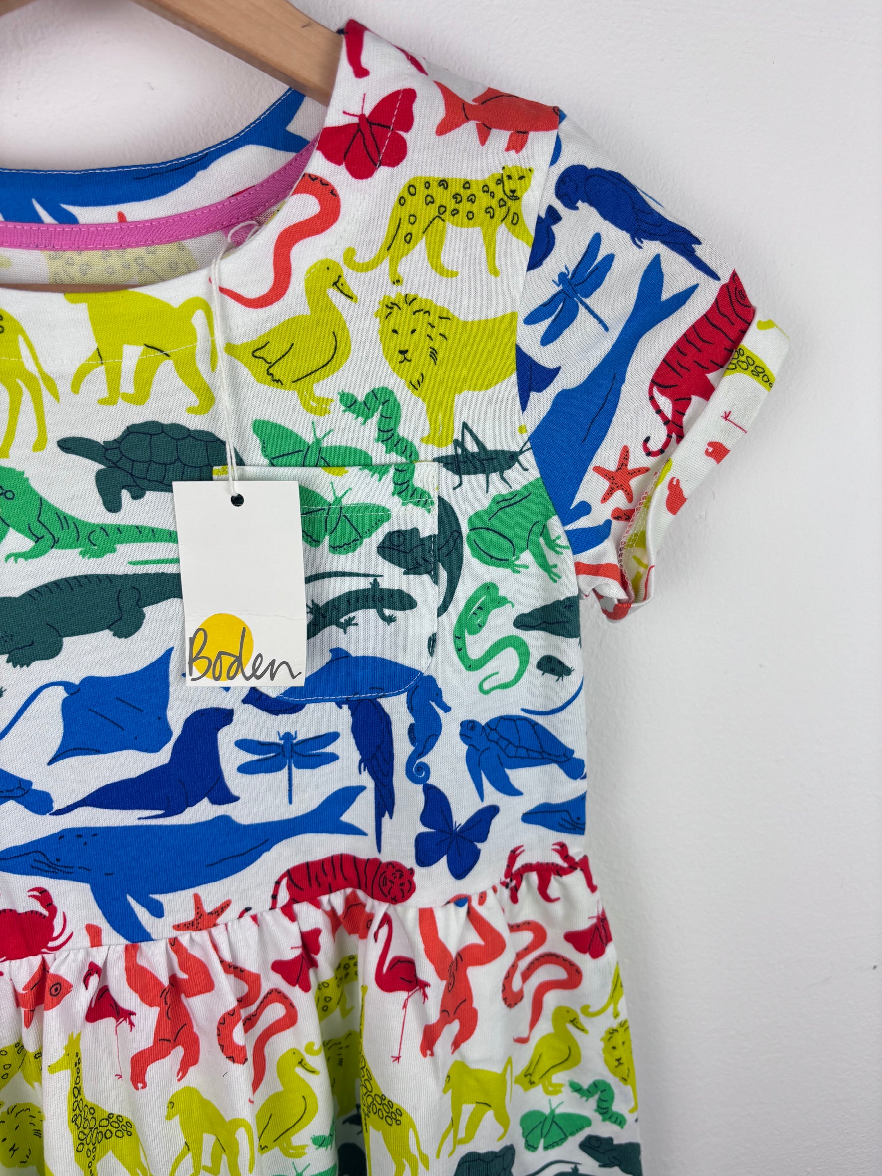 This Boden skater dress has a colourful all over animal print that stands out beautifully. It is made from soft cotton with short sleeves and a gentle stretch, making it really comfortable for play and warm weather. The fitted top and twirly skirt shape are classic Boden and easy for children to wear. This dress is new with tags and perfect for holidays, parties or everyday fun. A great second hand choice that supports preloved fashion while still feeling special for your child to enjoy.