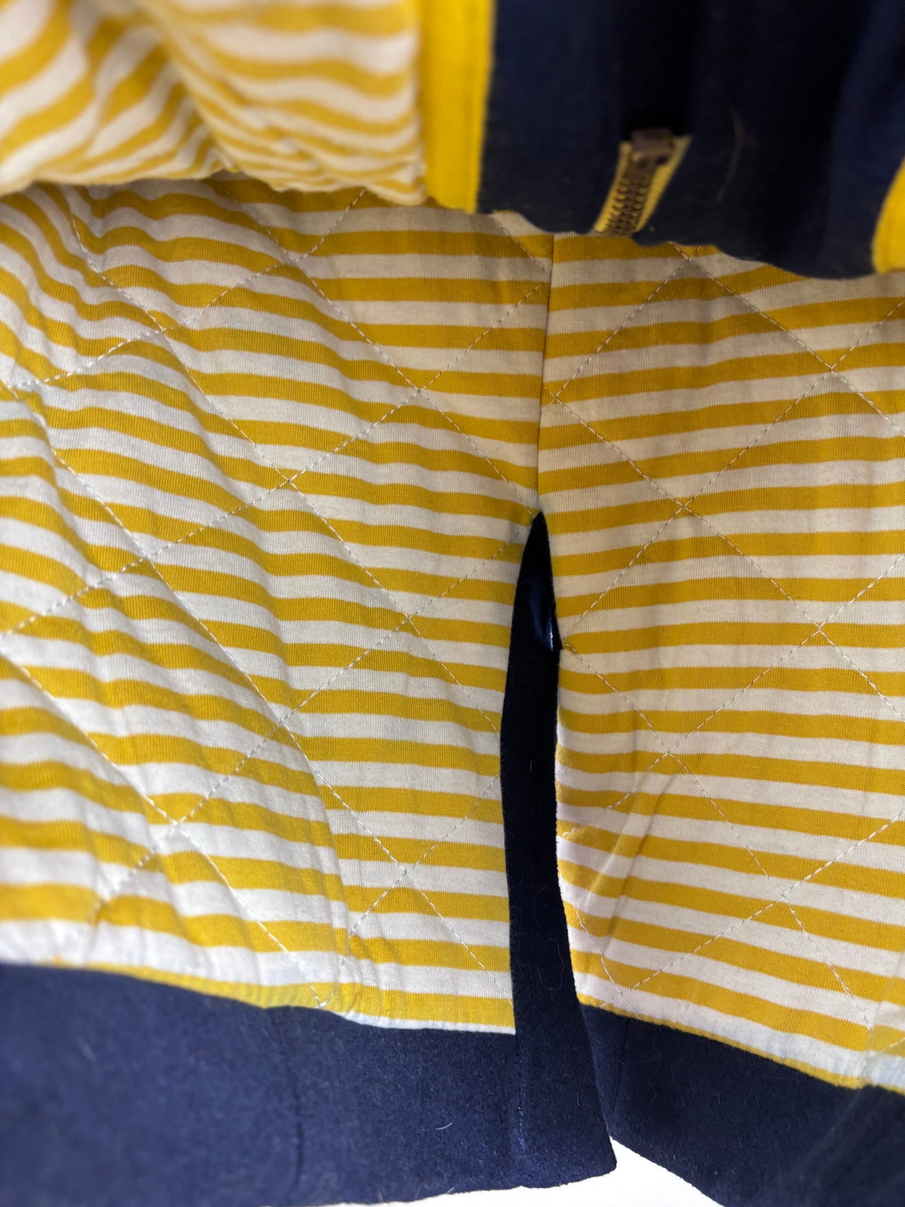 This Boden duffle coat in excellent condition has a soft wool feel and a classic navy design with a yellow striped lining. The wooden toggles give it a traditional look and the pockets add a useful touch. It has been dry cleaned so it feels fresh and ready to wear. This is a smart second hand coat for children who need something warm and cosy. A lovely preloved outerwear option for everyday outings and cooler days.