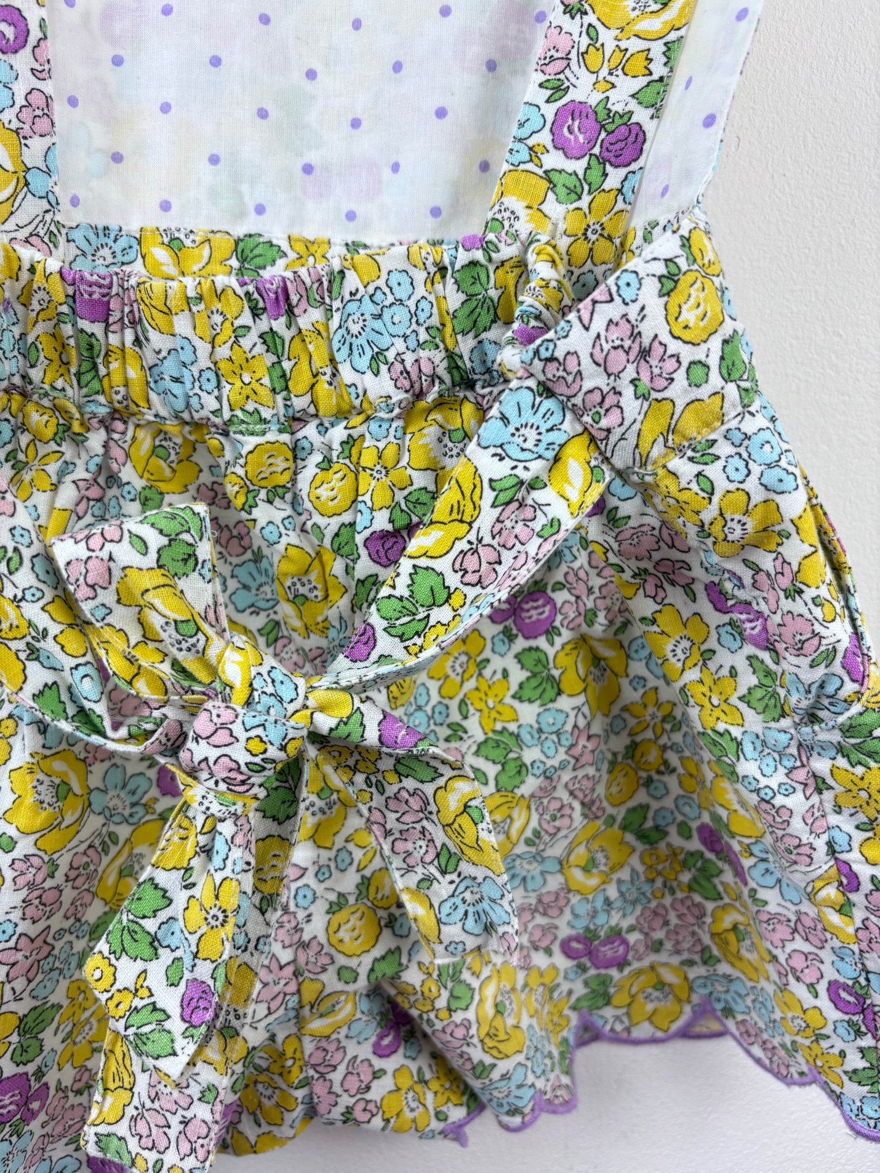 This pretty Mini Boden playsuit in size 5-6 years is full of summer charm. Made in a floral fabric with bright yellow, purple, and green shades, it features scalloped hems and adjustable button straps. Easy to wear and comfortable, it’s a practical piece for holidays, picnics, or casual outings. Mini Boden’s high-quality children’s clothes are designed to last, and this preloved playsuit is no exception. A lovely second hand choice that’s fun and sustainable for your child’s wardrobe.