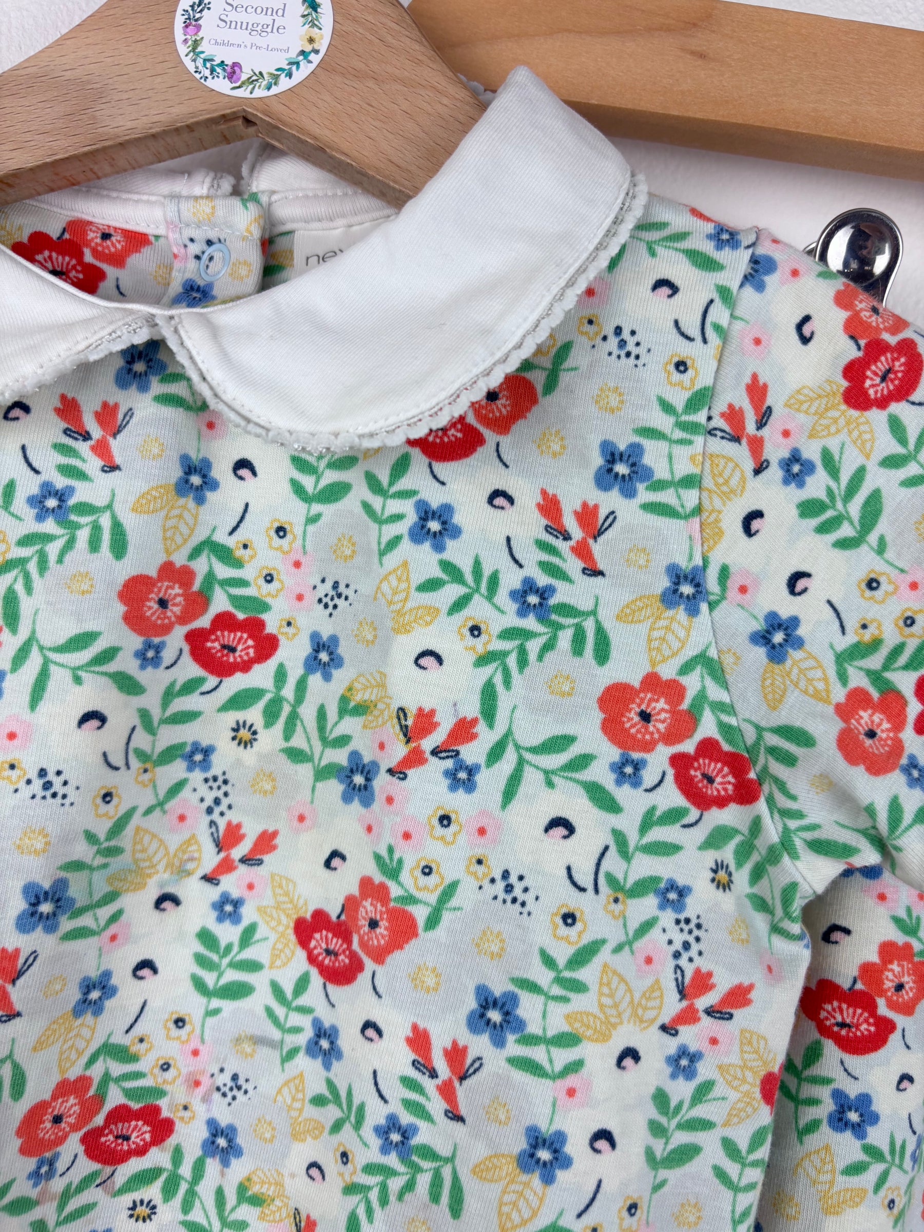 This Next set includes a floral top with a neat white collar and matching floral leggings. The design has bright red, blue and green flowers on a soft cream background, making it cheerful and fun. The top has short sleeves and buttons at the back while the leggings have an elastic waist for comfort. Condition is very good with little wear showing. Preloved children’s outfits like this prove that second hand fashion for babies can be sweet, practical and sustainable.