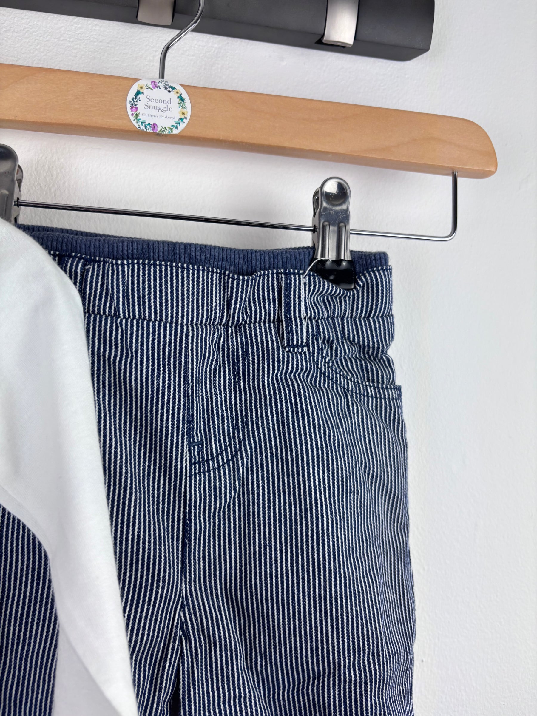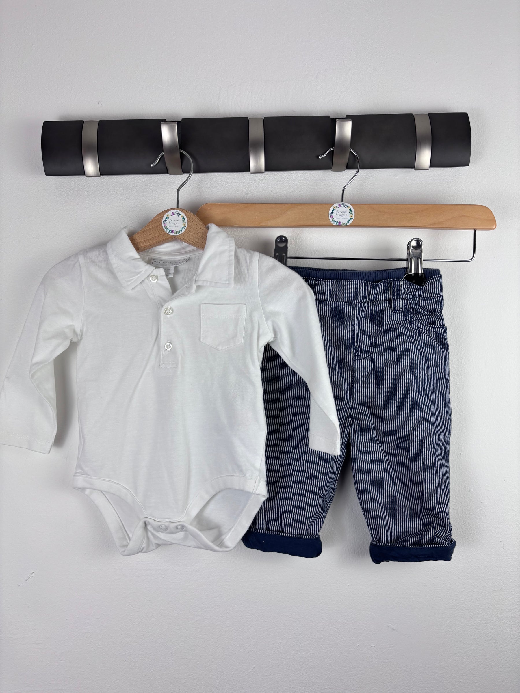 This beautiful set from The Little White Company in size 3-6 months is in excellent condition. It includes a soft white long-sleeve polo-style bodysuit and striped navy trousers with roll-up hems. Gentle on delicate skin, this outfit is perfect for smart-casual days or special occasions. This preloved set is a stylish second hand choice made with quality materials. Comfortable, classic and easy to wear, it’s a timeless outfit that’s both practical and elegant for little ones.