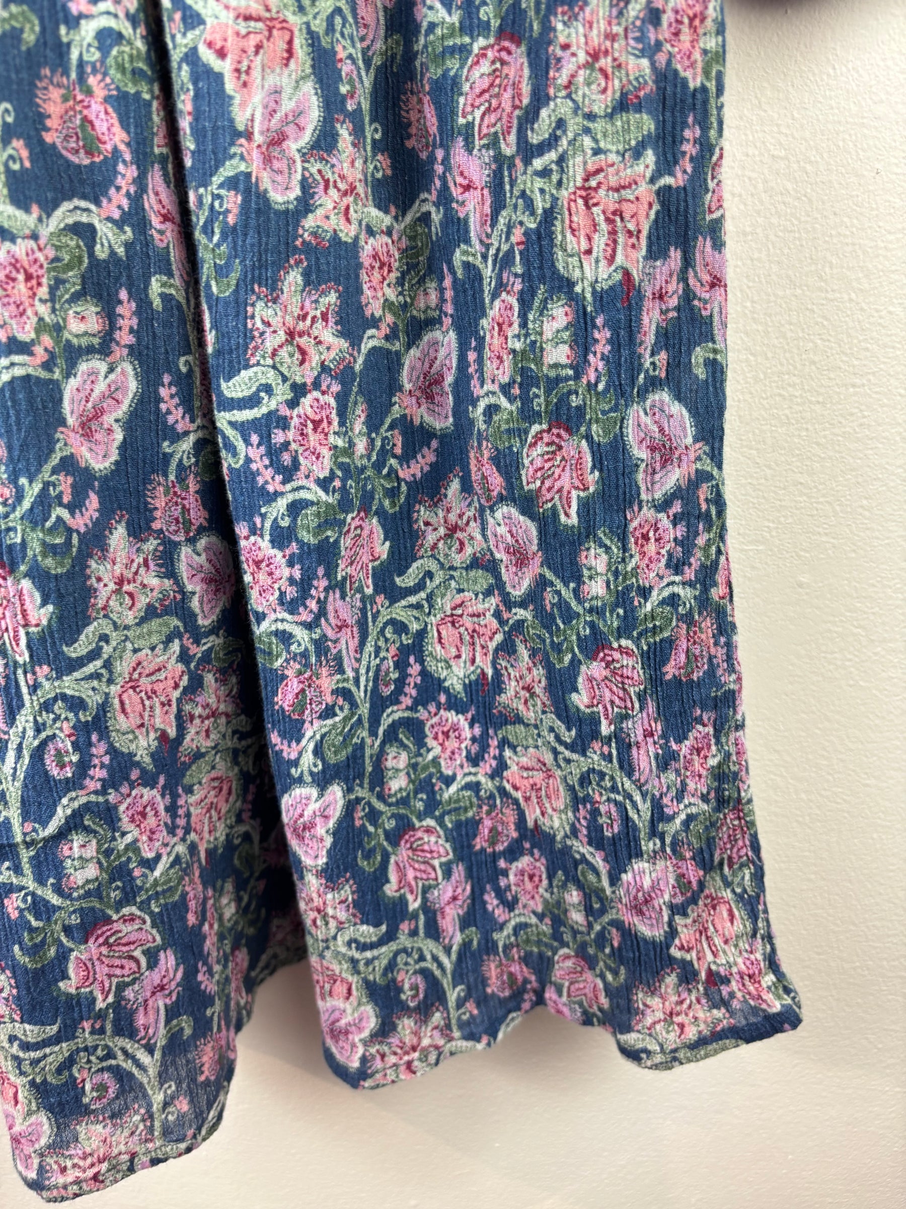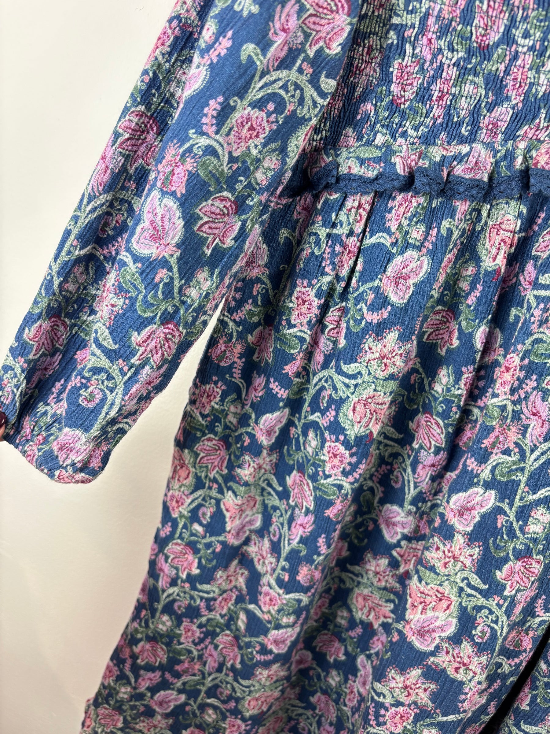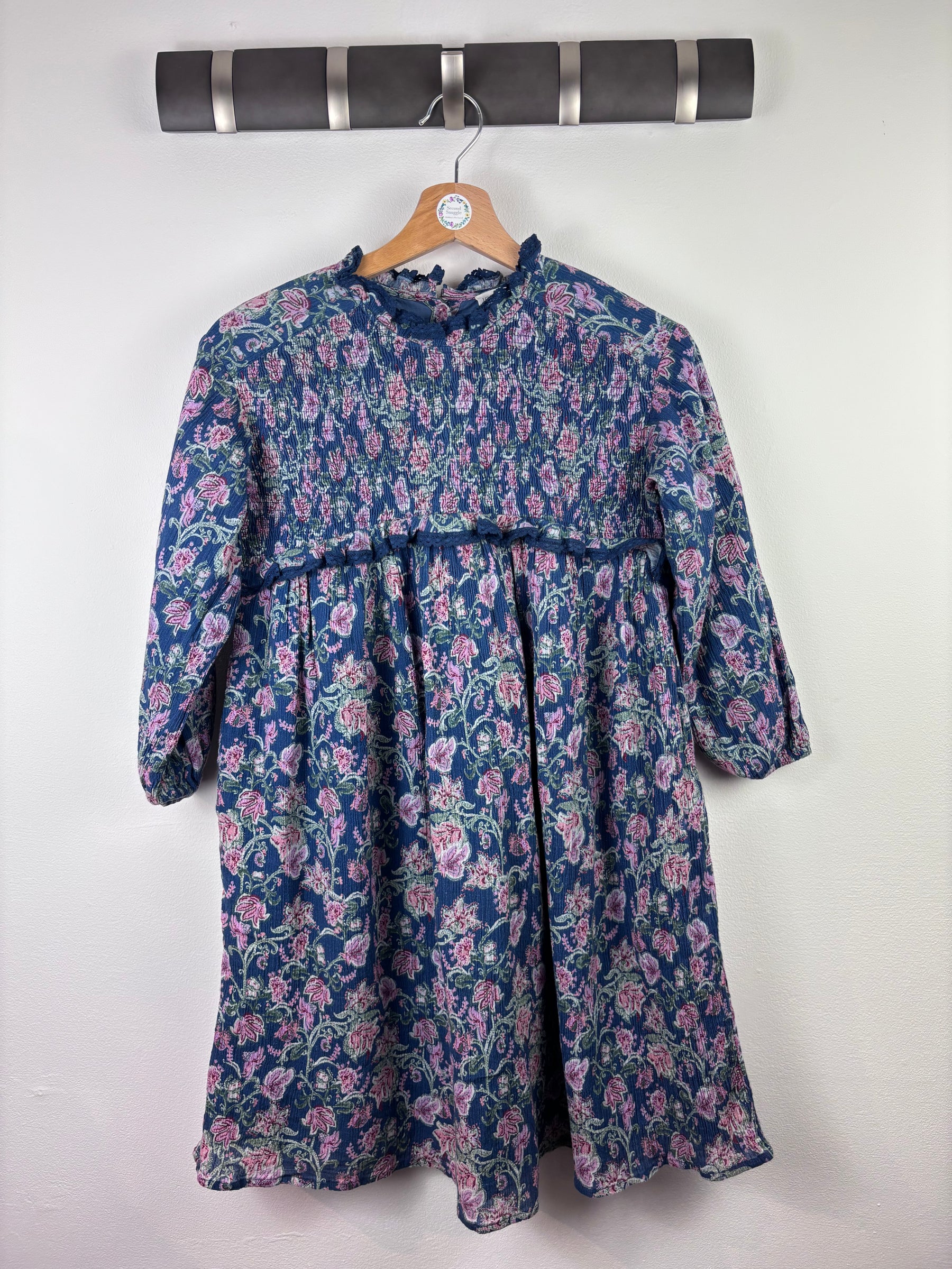 A stunning Louise Misha dress with a navy base and delicate floral print in soft pink and green tones. Featuring long sleeves, lace trim, and a gentle gathered waist, it’s beautifully detailed and perfect for special occasions. In excellent condition, this preloved designer dress feels elegant yet comfortable. A quality second hand piece that showcases the charm of slow fashion for children. Ideal for families who value timeless, sustainable clothing that’s made to be loved again. RRP £95