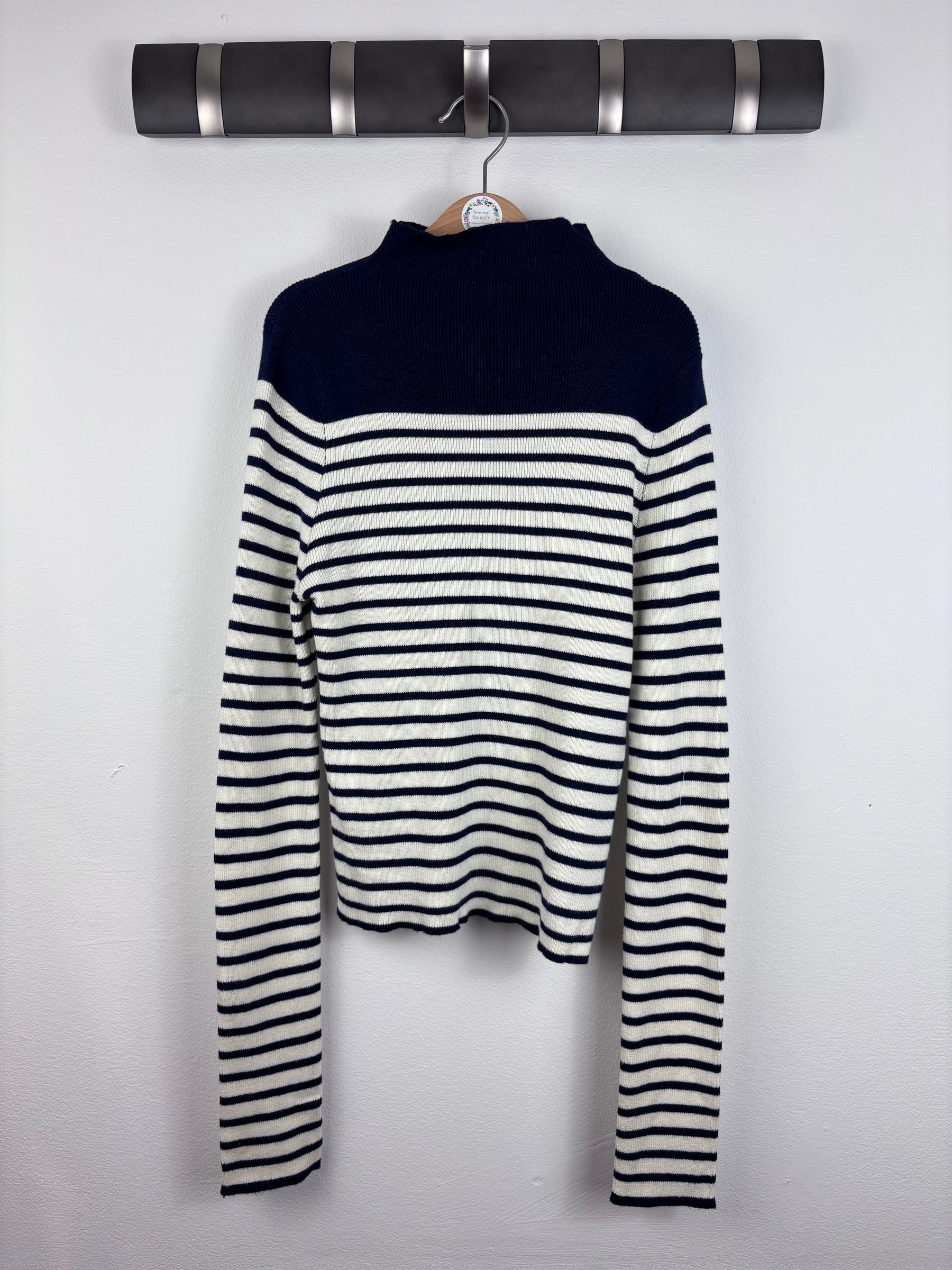 This New Look jumper has a bold navy top panel with cream and navy stripes running across the body and sleeves. It has long sleeves and a mock neck for extra warmth, making it perfect for cooler days. The knit fabric feels soft and cosy while still looking stylish for older kids and teens. Condition is excellent with no marks to note. Second hand clothes like this show how preloved fashion for children and teens can still look fresh and trendy.