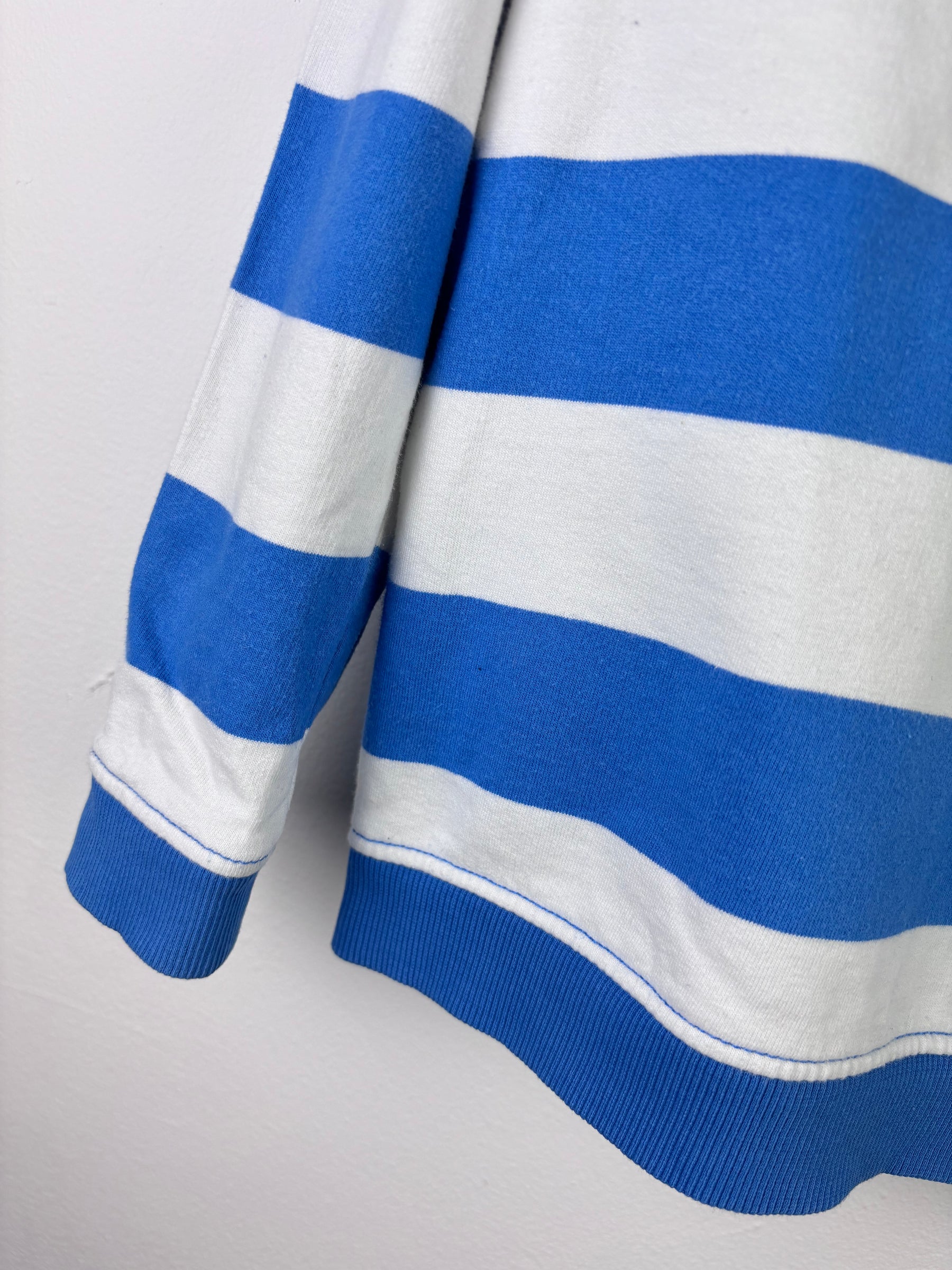 This Marks & Spencer hoodie features bold blue and white stripes with a cosy hood for added warmth. Made from soft sweatshirt fabric, it is comfortable and practical for everyday wear. The relaxed fit allows easy layering over t-shirts, making it ideal for school, weekends, or outdoor play. Finished with ribbed cuffs and hem for a snug feel. In good condition with general wear. A great casual staple for children’s wardrobes and a strong addition to preloved collections.