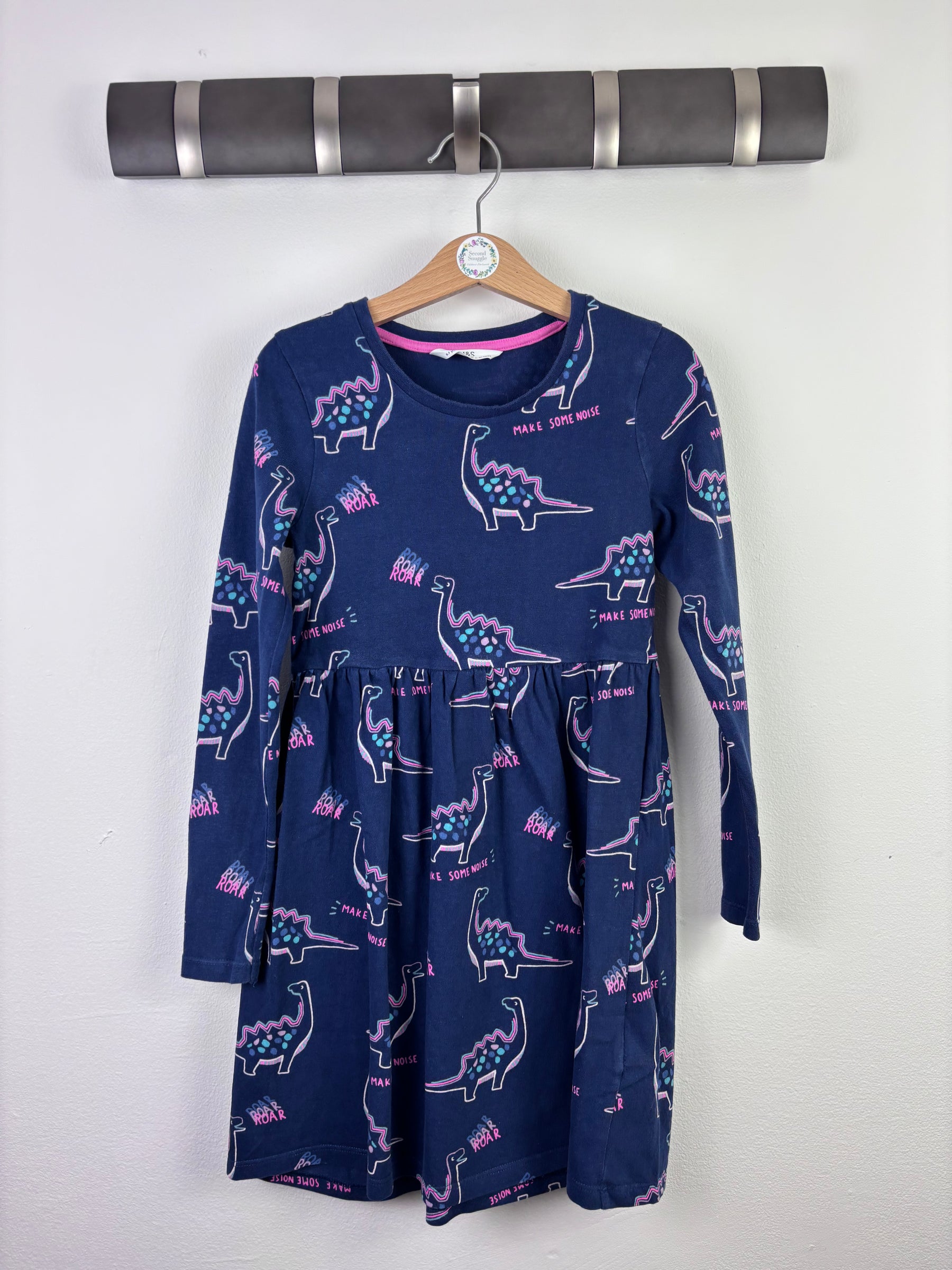 This M&S long sleeve dress features a navy base with an all-over dinosaur print and playful slogan details. Made from soft cotton fabric, it offers comfort and ease of movement for everyday wear. The gently gathered waist creates a relaxed fit while maintaining a neat shape. In good preloved condition with light signs of wear. Ideal for school, playdates or casual outings, this dress combines fun design with practical comfort for a sustainable children’s wardrobe.