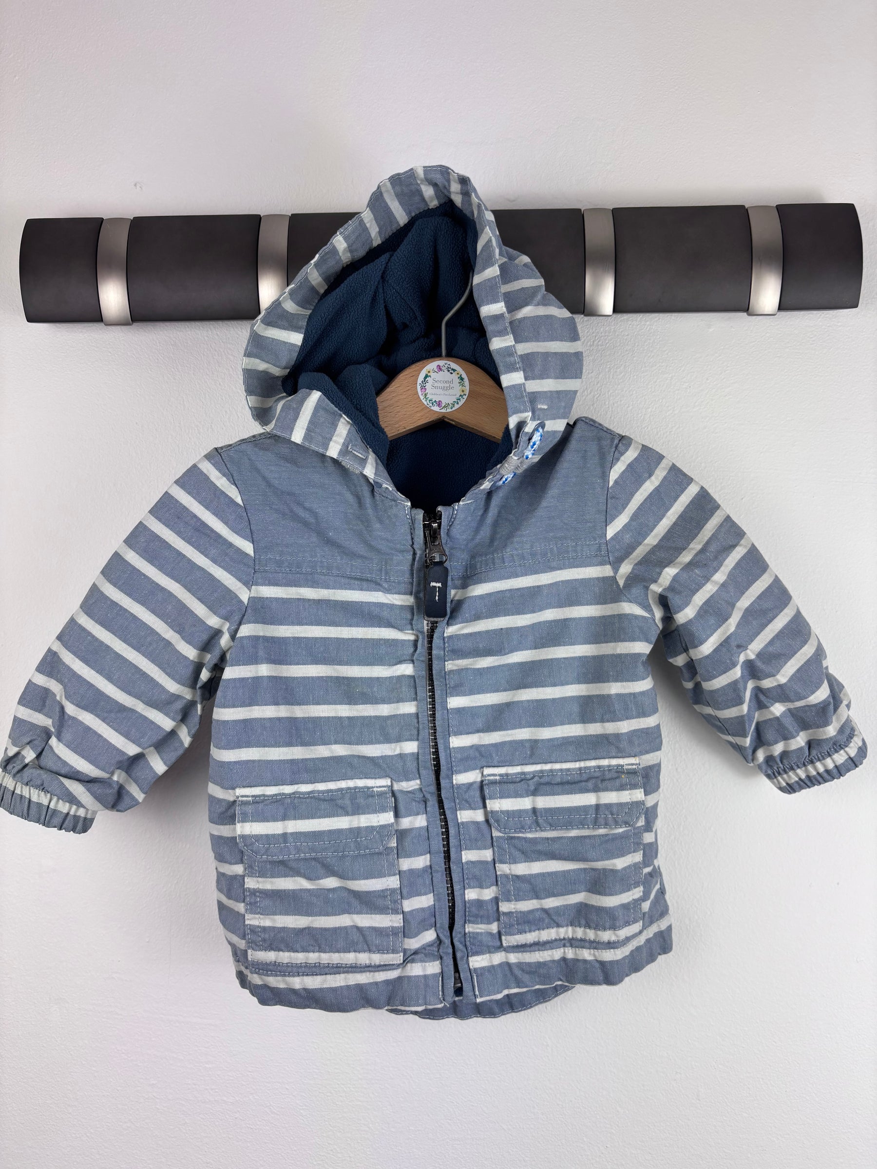 This M&S hooded jacket is a practical and cosy outer layer for babies. Made with a grey and white striped design, it features a zip fastening, front pockets, and a warm fleece lining for extra comfort. In good condition, this preloved baby jacket is perfect for keeping little ones snug on colder days. The hood adds extra protection against wind and chill, making it a must-have for everyday outings. A great sustainable choice, this second hand jacket combines affordability with quality baby clothing that lasts.