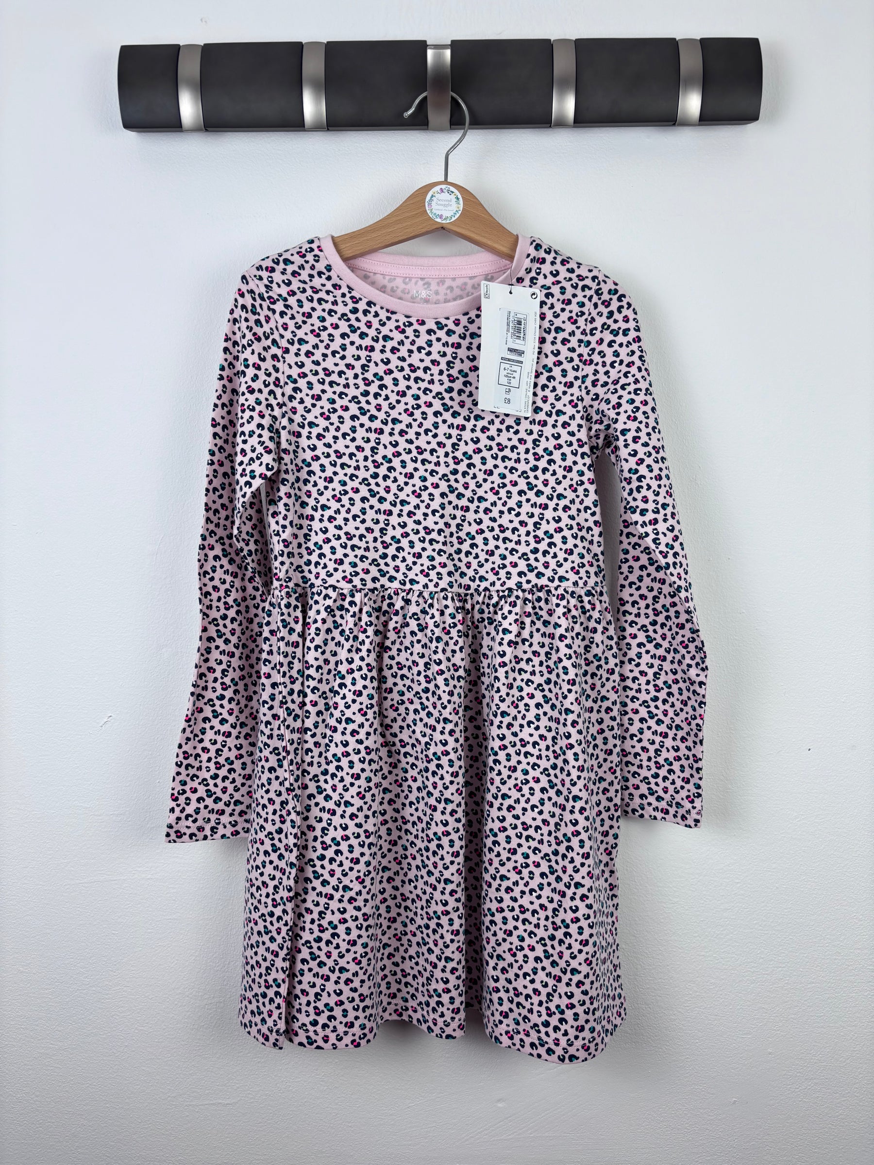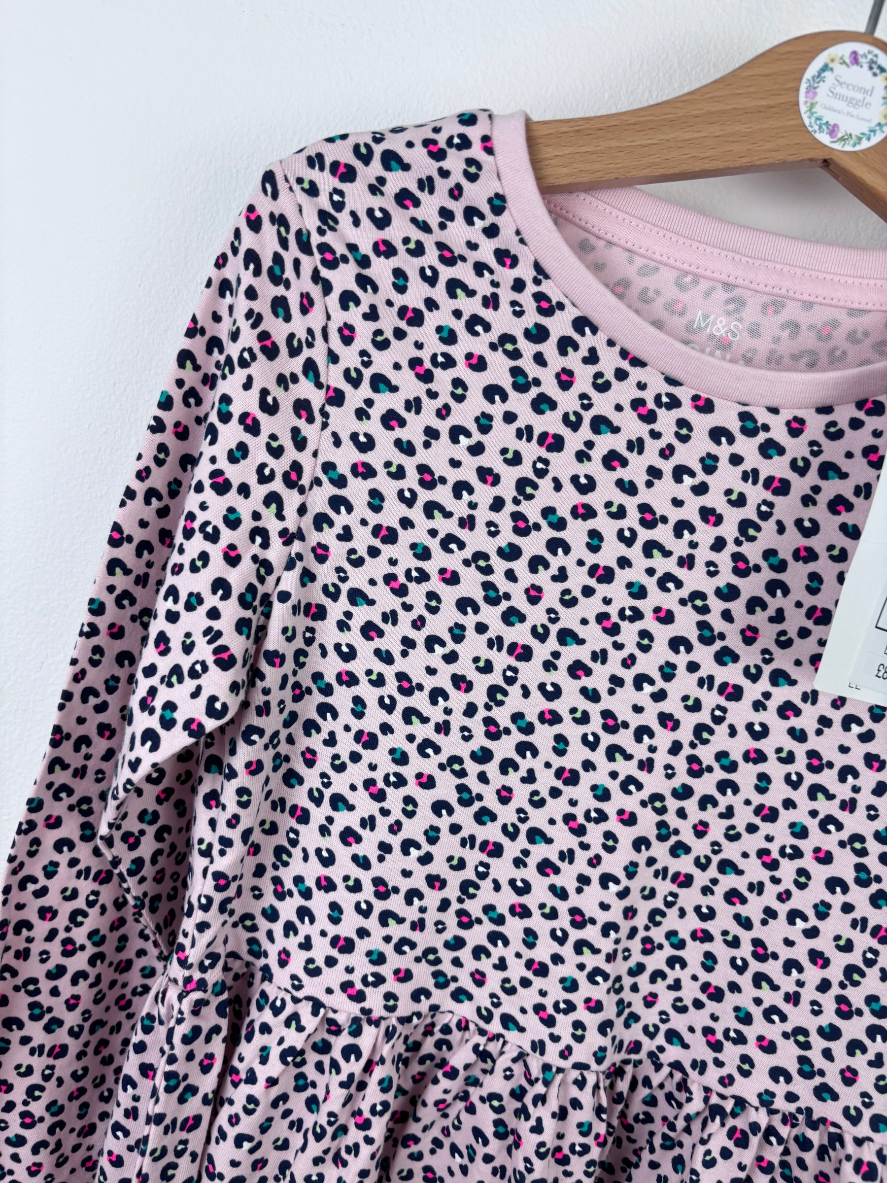 This M&S dress is pale pink with an all over leopard print in navy and soft pink. It has long sleeves and a gathered skirt which gives it a nice easy shape. The fabric feels soft and comfy which makes it great for everyday wear. This dress is brand new without tags and looks unused. It is perfect for children who enjoy fun prints and simple easy outfits. It is a great second hand and preloved fashion find for families who love quality M&S clothing.