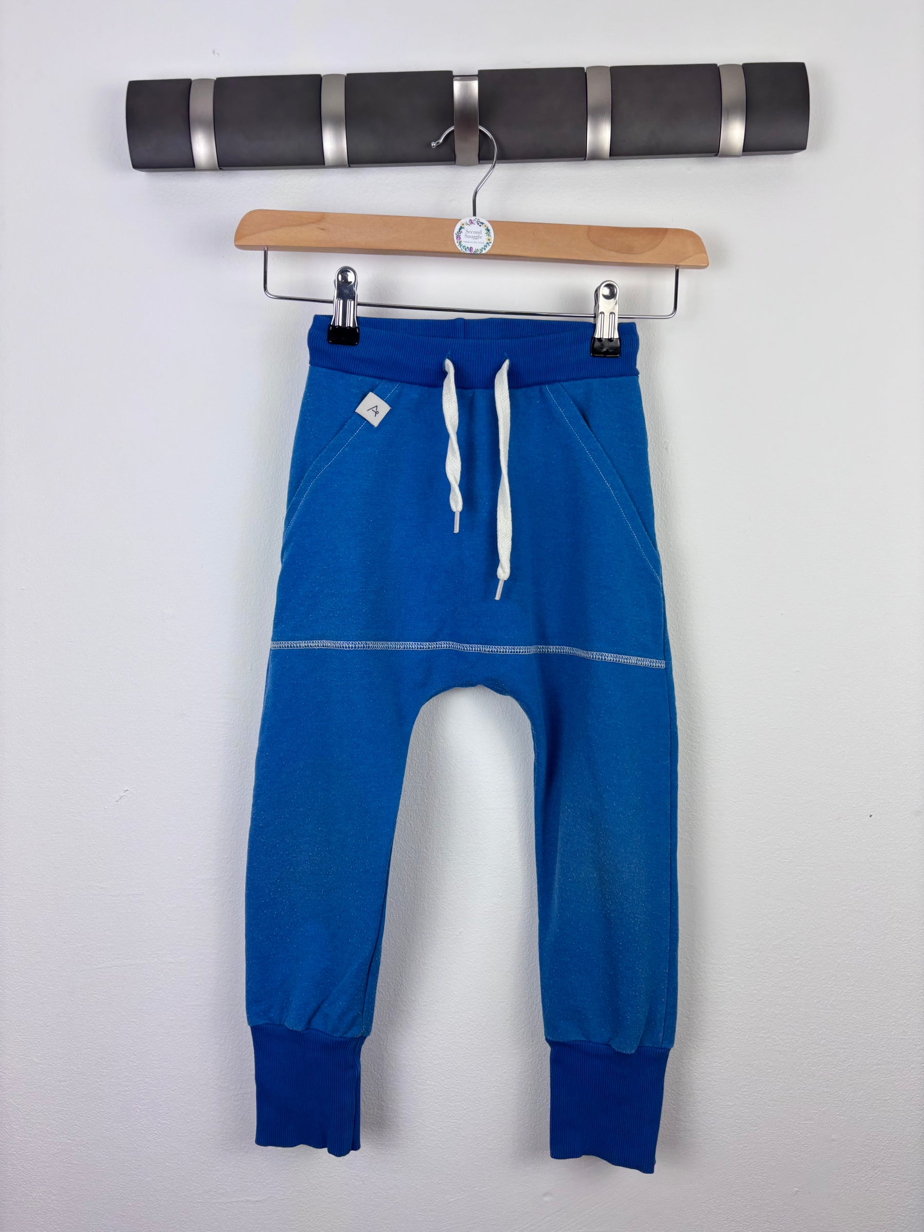 These bright blue joggers from Alba are made from soft organic cotton with a white drawstring and ribbed cuffs for a comfy fit. Designed for movement and play, they’re ideal for everyday wear. In good condition with light signs of use, these preloved joggers are a practical second hand choice for sustainable kids’ fashion that lasts and stays soft.