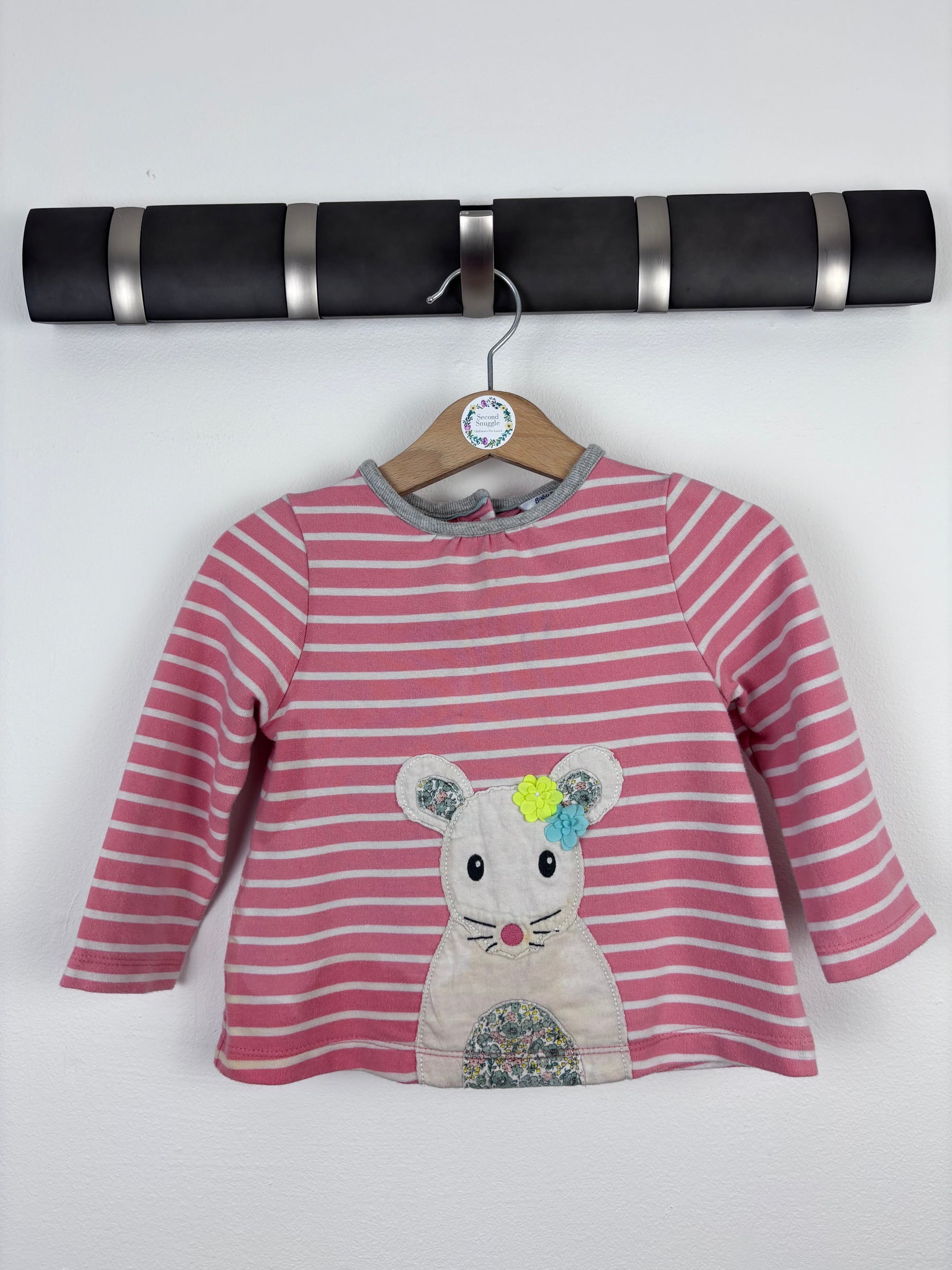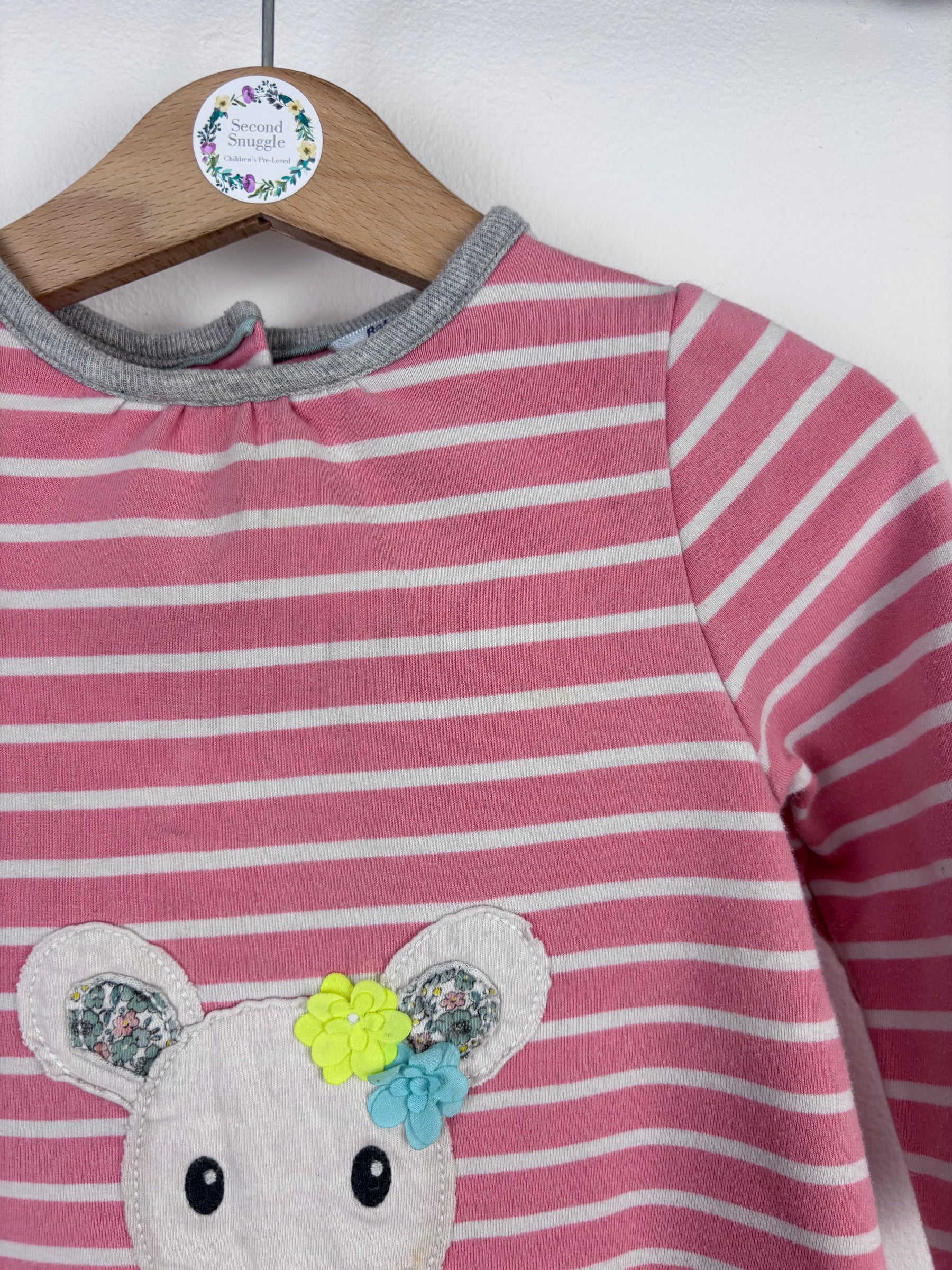 This long-sleeve pink stripe top from Boden features a cute appliqué mouse with a floral tummy and bow detail. Made from soft cotton for comfort, it’s great for playdays and layering. There’s a small mark on the front, reflected in the price. Still full of charm, this preloved top is a lovely second hand choice that brings character to baby wardrobes.