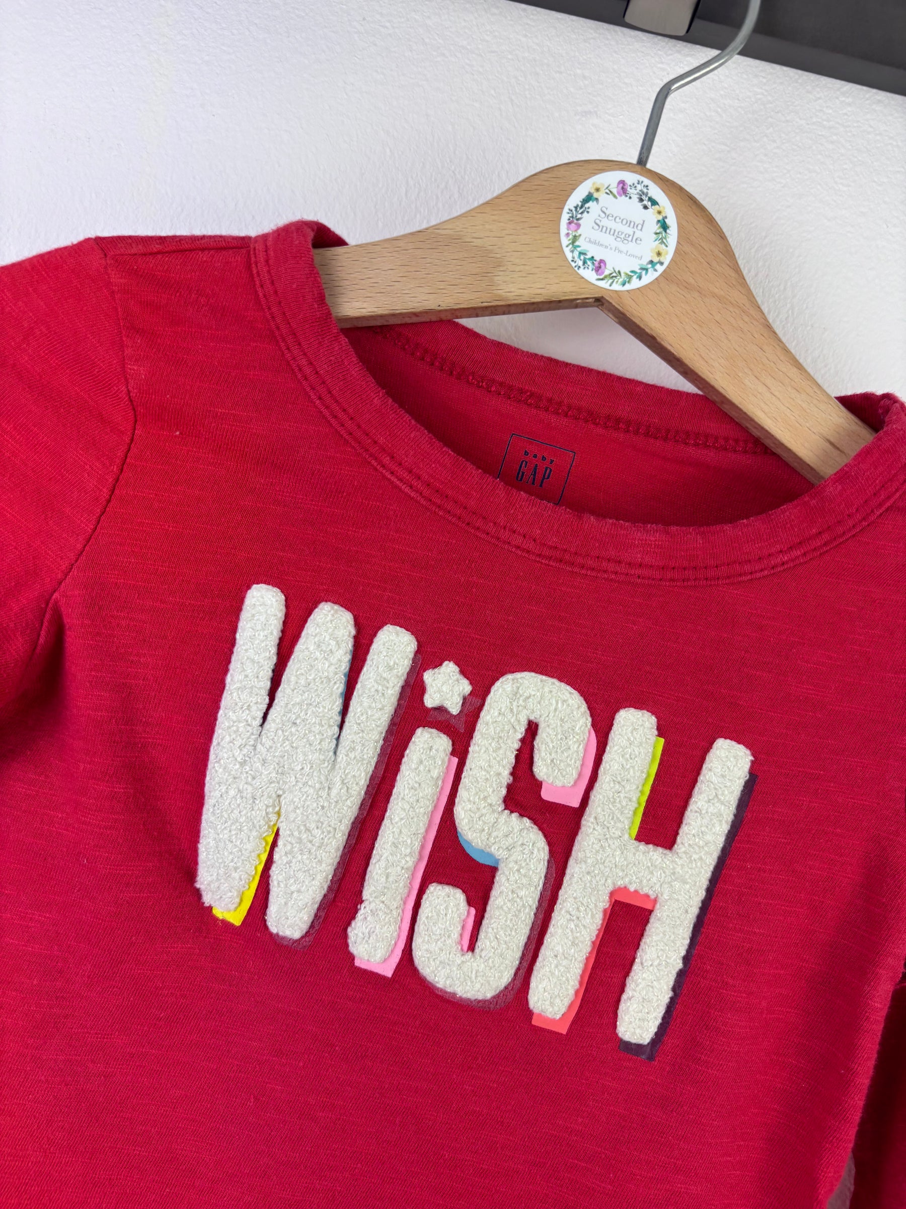 This Gap long sleeve top features a bold “Wish” slogan in textured lettering on a bright red background. Designed with a classic crew neckline and soft cotton fabric, it offers comfort and ease of movement. In good preloved condition with signs of gentle wear consistent with normal use. Ideal for festive seasons or everyday outfits, this top pairs easily with leggings or jeans and adds a fun pop of colour to a child’s wardrobe.