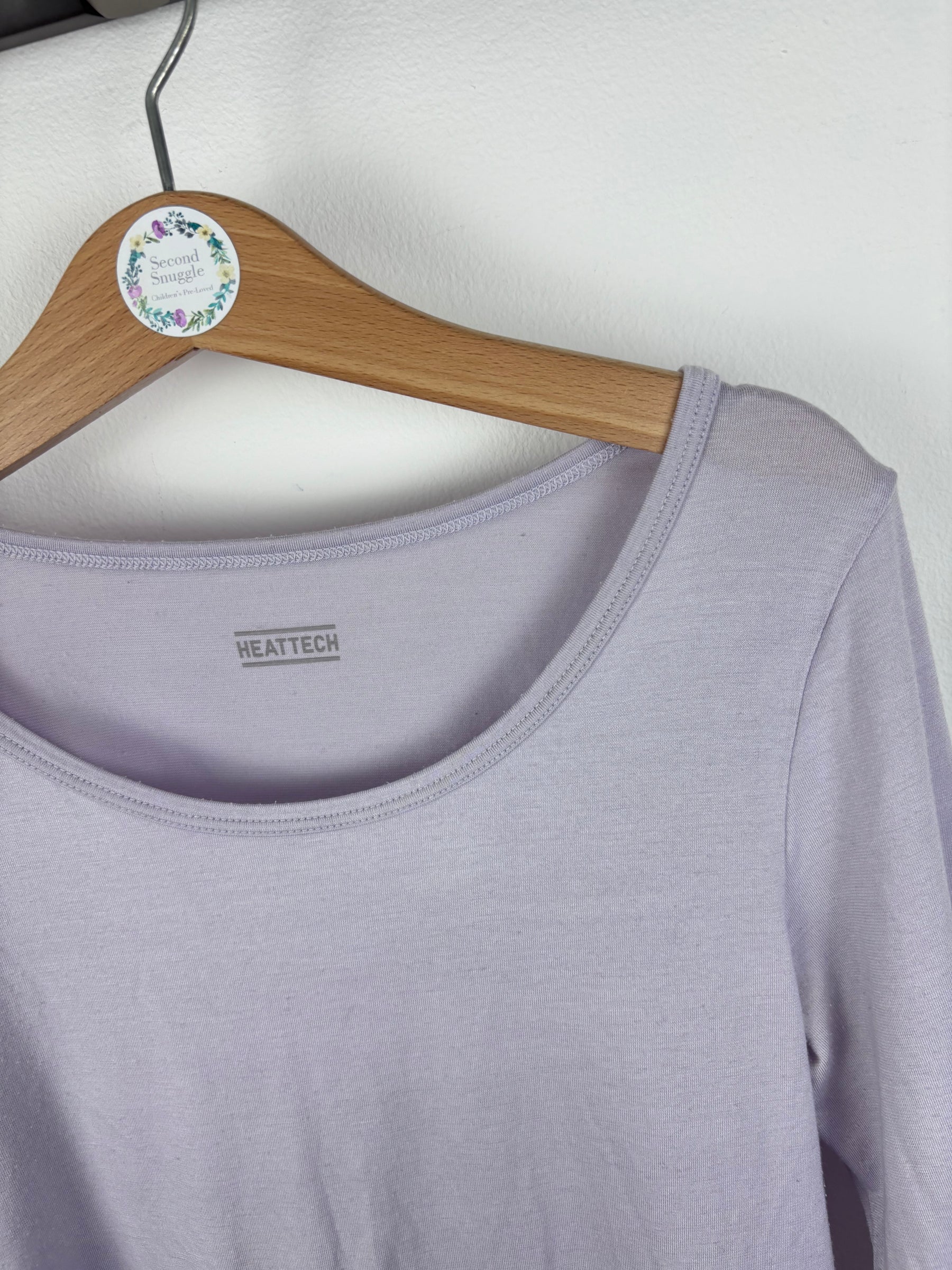 This Heattech long sleeve top is in good condition and comes in a soft lilac shade with a simple, clean design. It is made from lightweight thermal fabric that helps keep warmth in without feeling bulky, making it ideal for layering in colder weather. The fabric feels smooth and comfortable against the skin. This second hand top shows gentle signs of wear but still performs well. It is a preloved piece that works perfectly under school uniform, jumpers or hoodies during autumn and winter.