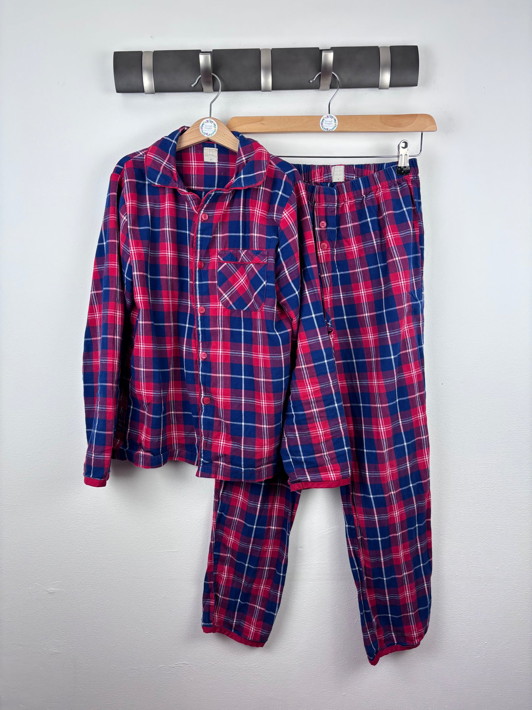 These cosy pyjamas from John Lewis are made from soft brushed cotton and feature a classic red and navy tartan pattern. The set includes a long sleeve button-up top with a chest pocket and matching full-length trousers with an elasticated waistband for comfort. Perfect for cold winter nights or festive mornings, they’re warm and breathable. This preloved pair has been well looked after and makes a lovely second hand addition to children’s nightwear collections. Ideal for snuggling up with a hot chocolate or unwrapping presents on Christmas morning.