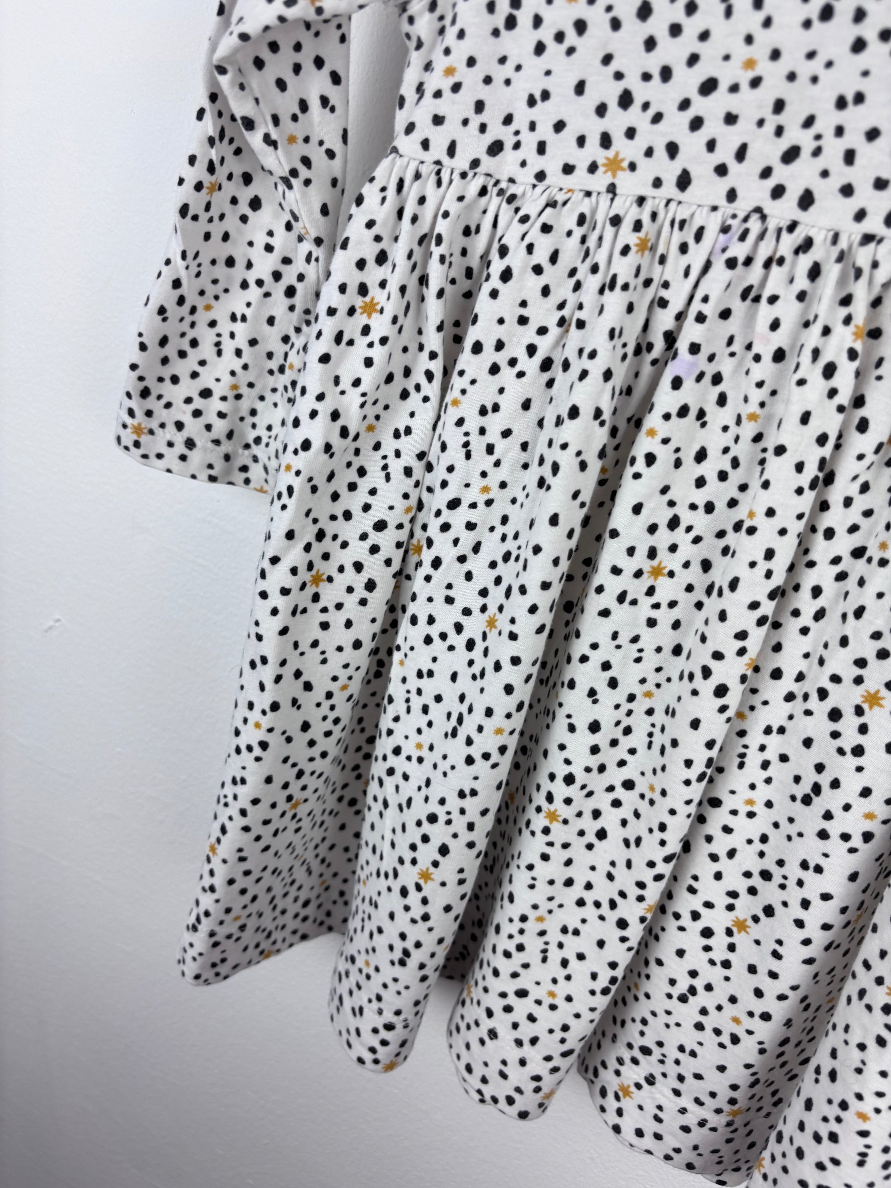 This long sleeve dress from John Lewis features a playful spot print with tiny star details scattered throughout. The gathered skirt gives it a lovely swish while still being easy for everyday wear. It has a soft feel and a comfortable fit, making it great for cooler days with tights or leggings. The condition is good, with some gentle signs of wear but plenty of life left. This dress is second hand and ready for its next adventure. It is also preloved children’s fashion, a practical choice for baby wardrobes and growing kids.