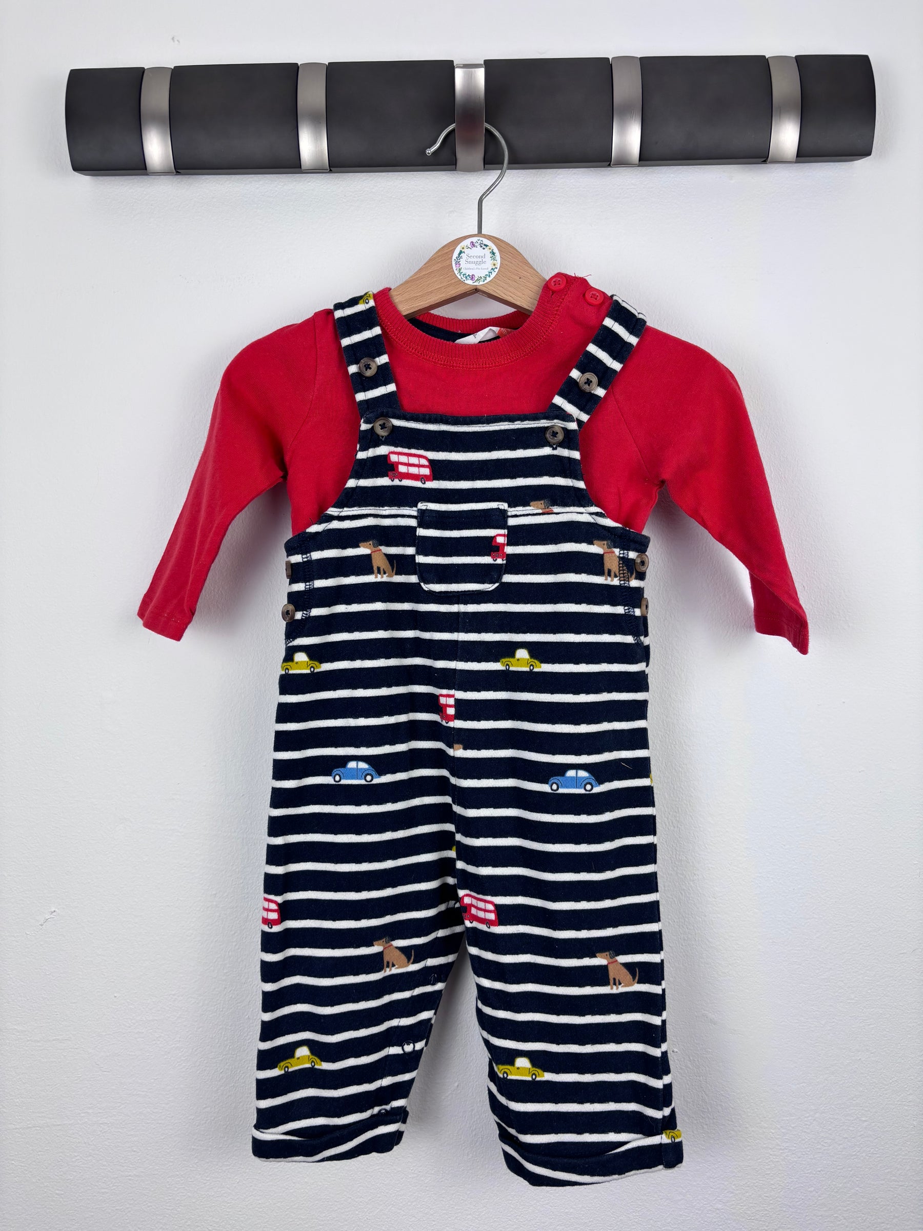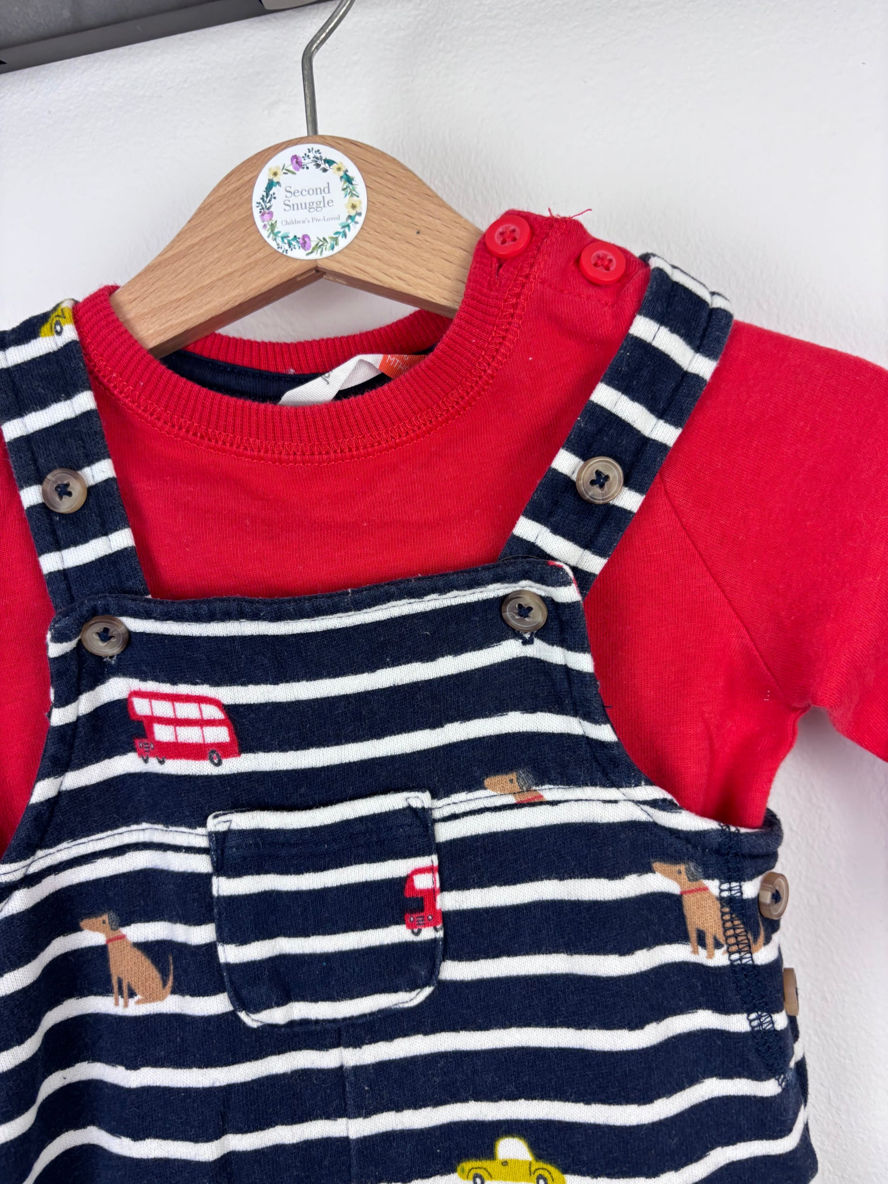 This adorable John Lewis outfit includes navy and white striped dungarees paired with a bright red long-sleeve bodysuit. The dungarees have sweet embroidered vehicles, buttoned shoulder straps, and a front pocket for extra charm. Made from soft cotton, the set is gentle on delicate skin and easy to put on and take off. Perfect for playtime or outings, it’s both practical and full of fun detail. This preloved outfit has been thoughtfully cared for and makes a wonderful second hand choice for parents who love quality and comfort in their baby’s wardrobe.